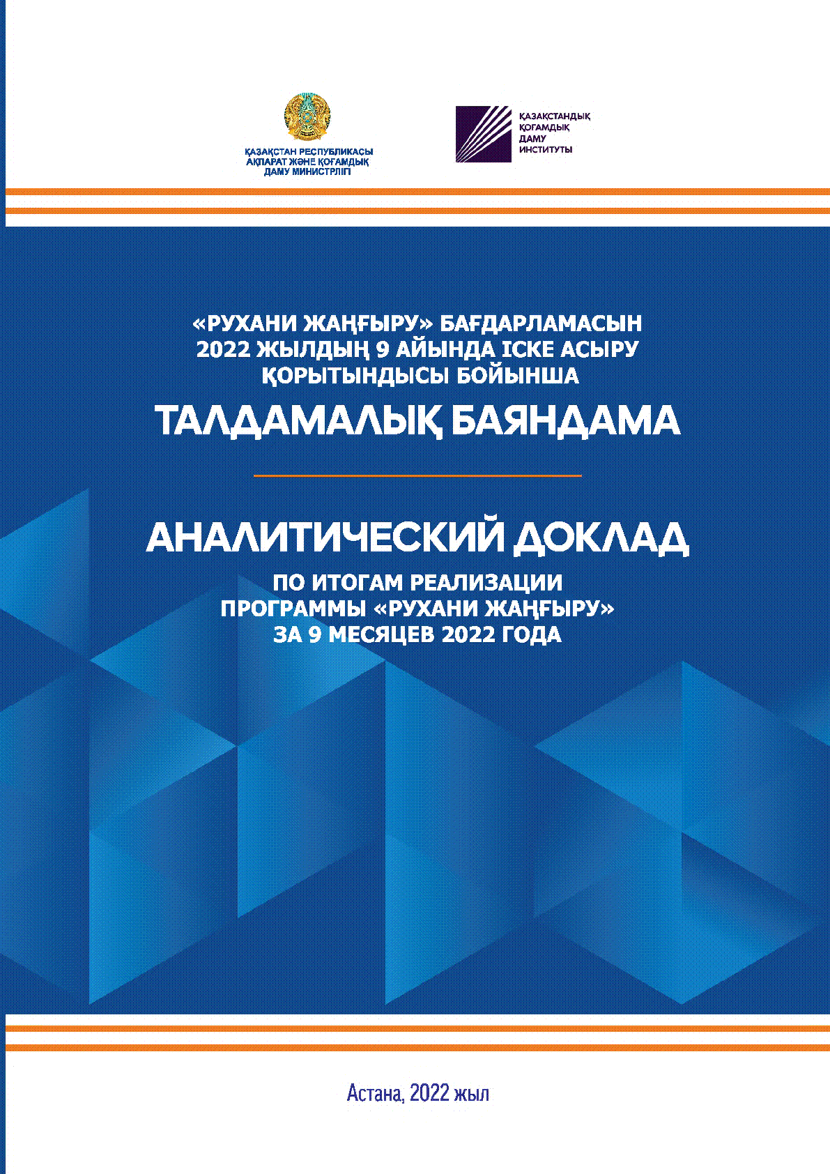 "Рухани жаңғыру" бағдарламасын 2022 жылдың 9 айында іске асыру қорытындысы бойынша талдамалық баяндама [Мәтін] / ; ҚР Ақпарат және қоғамдық даму министрлігі ; Қоғамдық даму ин-ты... – Астана : [б. ж.], 2022. - 200 б., суретті; - "Рухани жаңғыру" бағдарламасы. - Мәтін қаз., орыс тілд. . – Библиогр.: 100 б., 200 б. . – [т. ж.] –