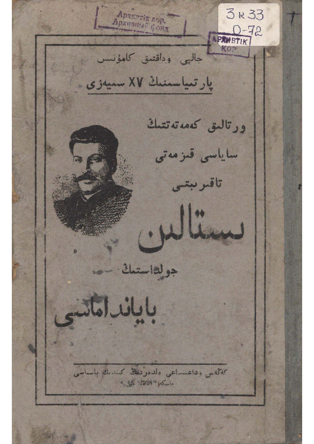 Орталық Комитеттің саяси қызметі тақырыпты Сталиннің баяндамасы = ورتالىق كامەتەتتىڭ ساياسى قىزمەتى تاقىرىبتى ستالىن جولداستىڭ بايانداماسى [Мәтін] / Сталин И.В. ... – Москва : Кеңес одағындағы елдердің кіндік баспасы, 1928. - 144 б. - Мәтін араб графикасымен жазылған. . .