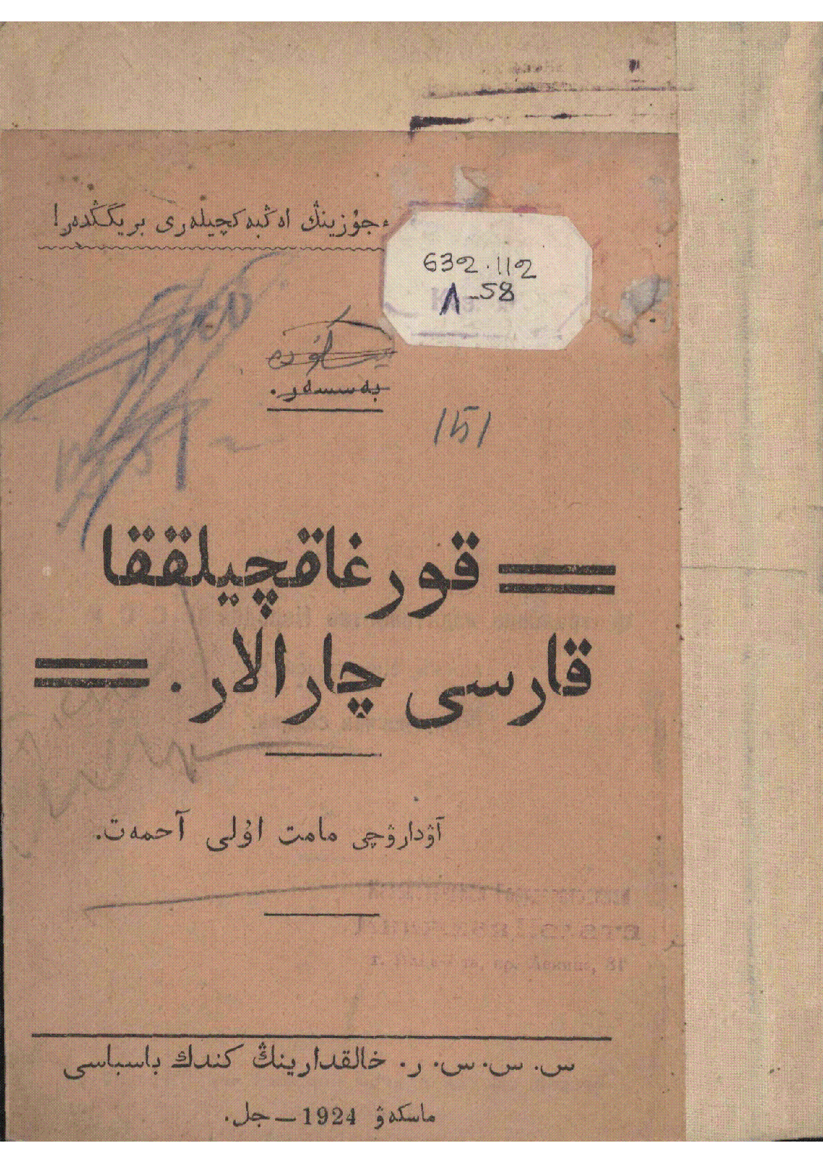 Құрғақшылыққа қарсы шаралар = قۇرعاقچيلققا قارسى چارالار [Мәтін] / Е. Ф. Лискун ; ауд. Ахмет Мәметұлы... – Москва : Кеңестер одағындағы елдердің кіндік баспасы, 1924. - 52 б. 17,5х13 см - Мәтін араб графикасымен жазылған . . – 4000 дана : 17 т.