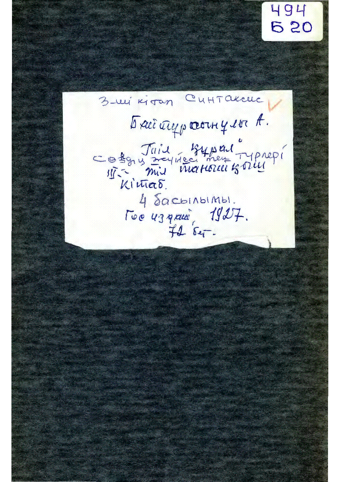 Тіл құрал = ءتىل - قورال [Мәтін] : сөздің жүйесі мен түрлері / А. Байтұрсынов . – 3-інші тіл танытқыш кітап, 4-інші басылуы .. – Қызылорда : Қазақ мемлекет баспасы, 1927. - 73 б. 24х16,5 см - Мәтін араб графикасымен жазылған . . – 13000 дана