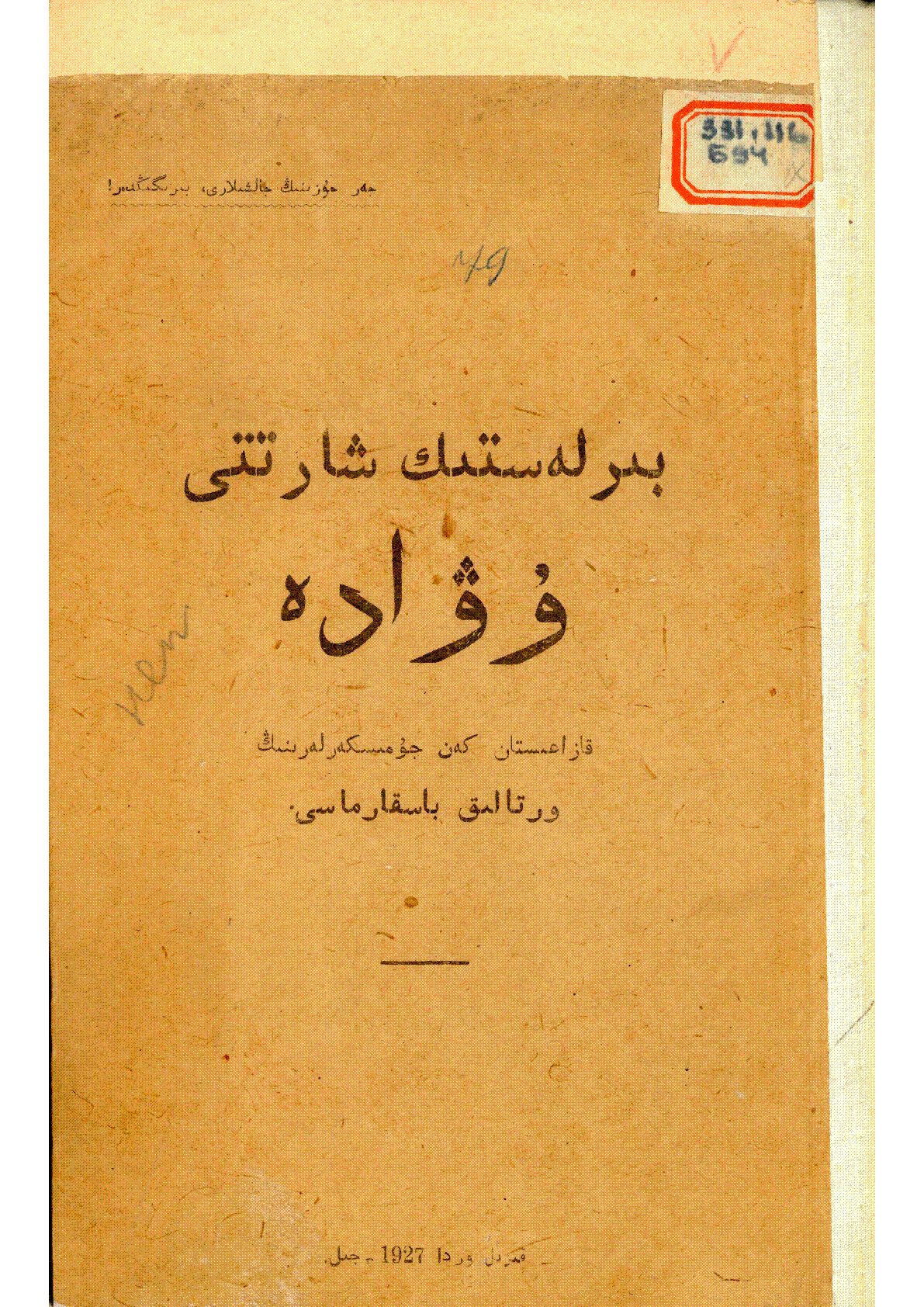 Бірлестік шартты уәде [Мәтін] : Қазақстан кен жұмыскерлерінің орталық басқармасы / ... – Қызылорда : Қазбас, 1927. - 51 б. 26х17 см - Мәтін араб графикасымен жазылған . . – 1000 дана