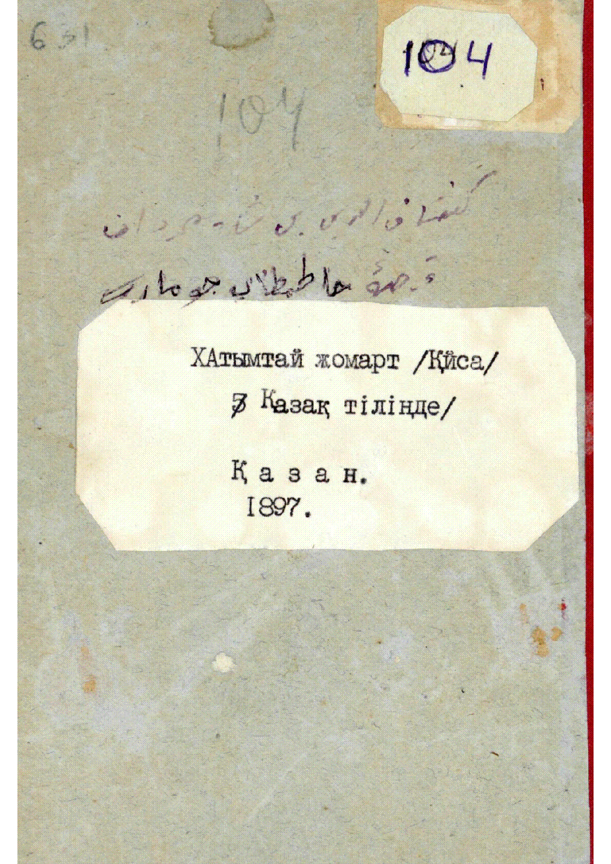 Қисса-и Хатымтай Жомарт = قصهء حاطم طی جومارد [Мәтін] / Кашшафуддин ... – Қазан : М.А.Чиркова уәрсәләрінің табиғханасы, 1897. - 16 б. - Мәтін араб графикасымен жазылған, Атымтай жомарт туралы. ҚРҰК-на 1938 жылы түскен . .