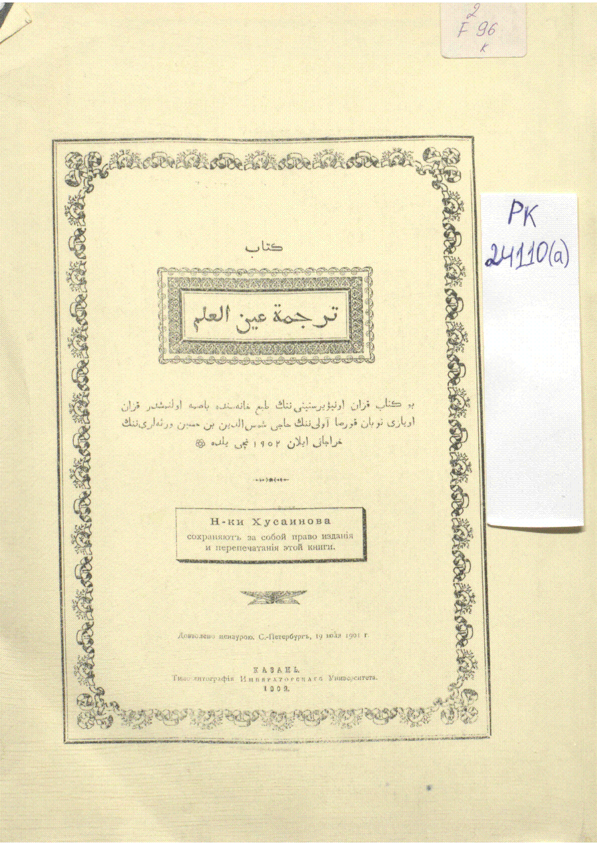 Китаб таржамат ғайн әл-ғилм = كتاب ترجمة عين العلم = Ғылым көзінің тәржімесі [Мәтін] / Әл-Мадаини Абдулла бин Абдуррахман ; бастырушы Хұсайынов Ш. уәрсәләрі... – Қазан : Университет табиғханасы, 1902. - 232 бет 28,5 см - "Мәдени мұра" бағдарламасы бойынша, Мәтін араб графикасымен жазылған, Көшірме . .