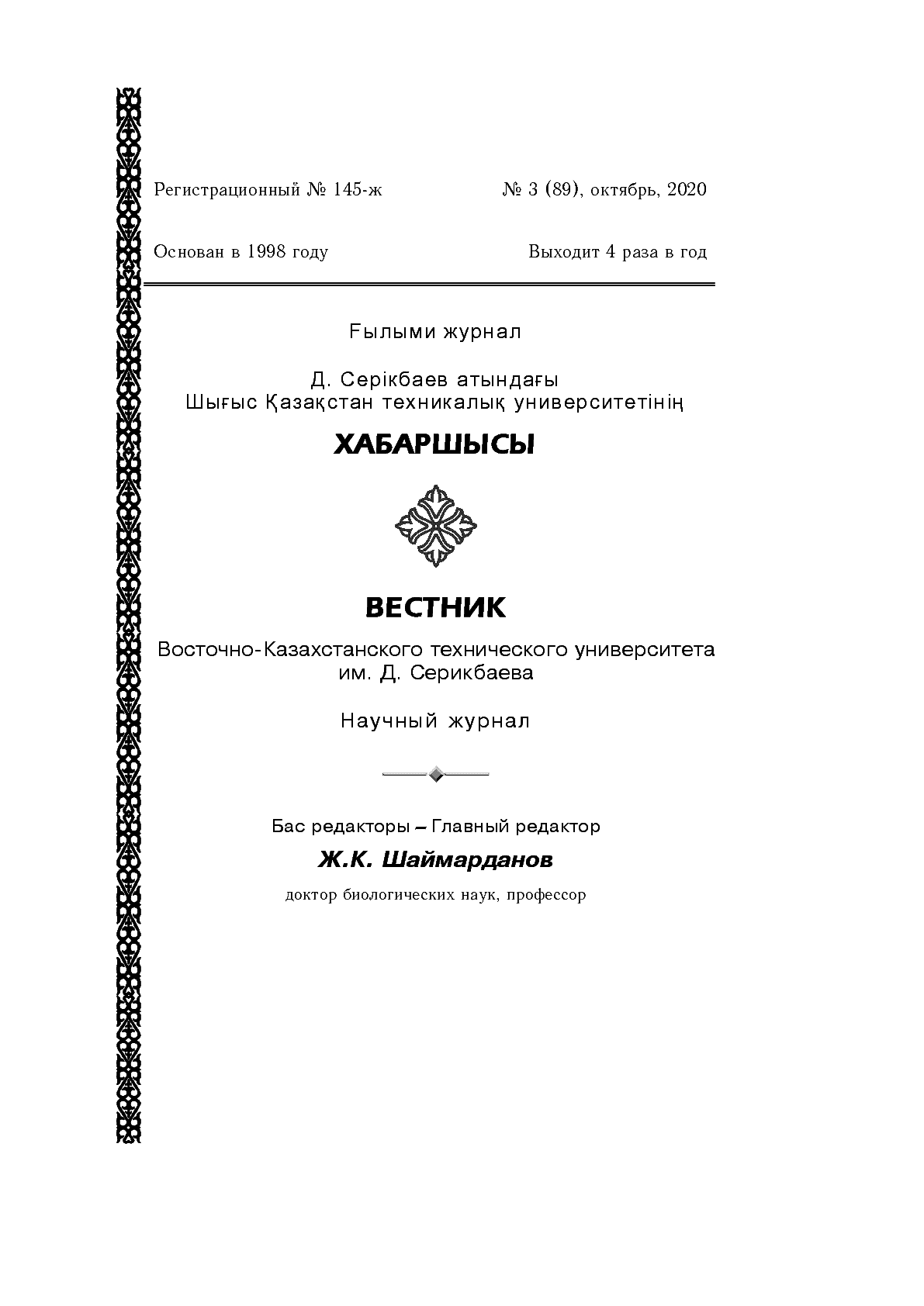 Д. Серікбаев атындағы Шығыс Қазақстан техникалық университетінің хабаршысы = Вестник Восточно-Казахстанского государственного технического университета им. Д. Серикбаева [Мәтін] : ғылыми журнал ; бас ред. Ж. К. Шаймарданов ; [ред. алқасы: О. Д. Гавриленко [ж. б.] ; Д. Серікбаев атын. Шығыс Қазақстан техн. ун-ті]. – Өскемен : [б. ж.], 2020. - .– 350 дана.– Жылына 4 рет шығады. – ISSN 1561-4212. 2020, № 3 (89). - 350 дана