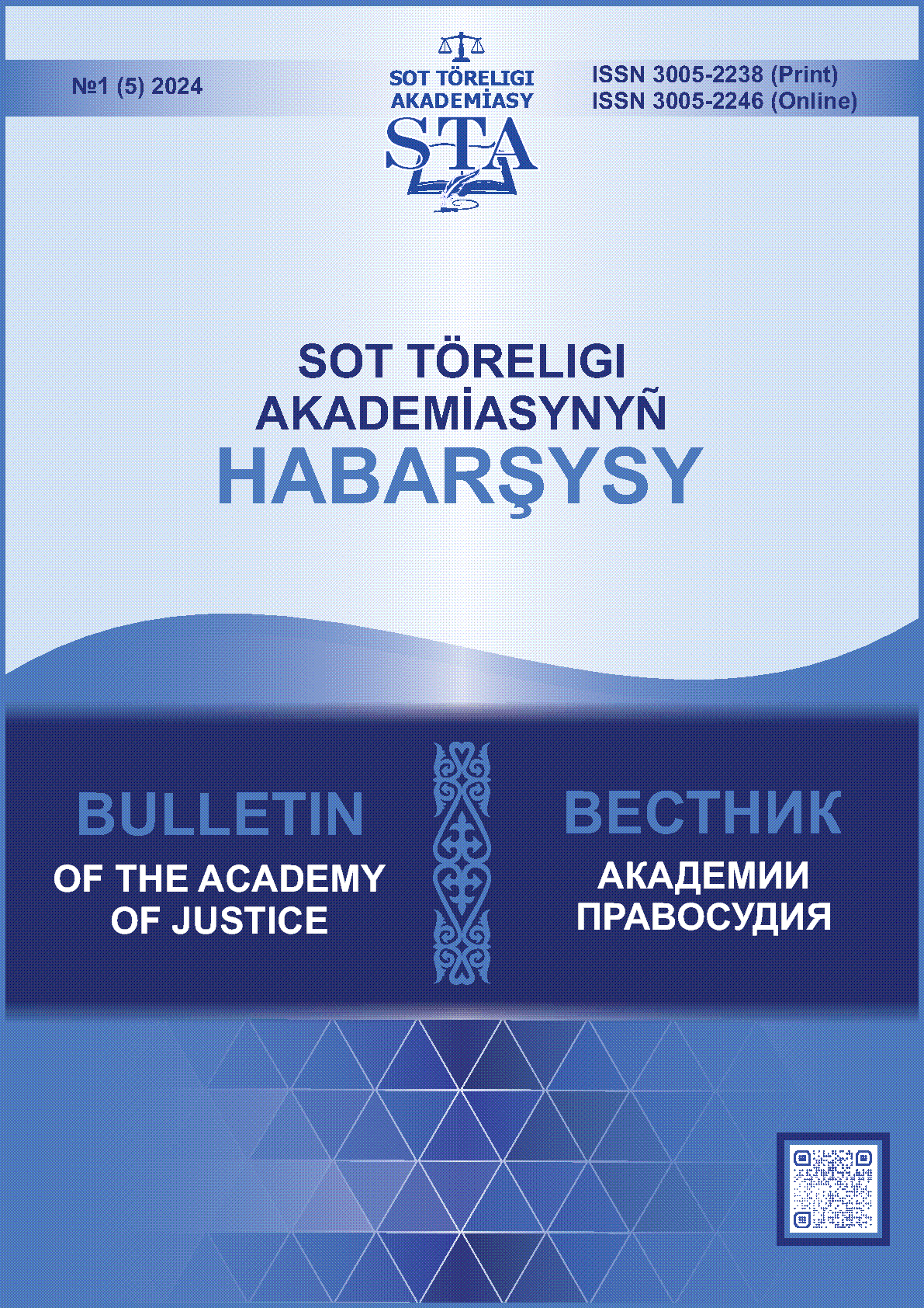 Сот төрелігі академиясының хабаршысы = Научный журнал «Вестник академии правосудия» = Scientific journal «Bulletin jf the academy of justice» [Мәтін] : ғылыми журнал ; «Қазақстан Республикасы Жоғарғы Сотының жанындағы Сот төрелігі Академиясы» ; бас ред. З. Х. Баймолдина, Т. К. Бурбаев. – Астана : [б. ж.], 2024. - .– 100 дана., – Жылына 4 рет шығады. – ISSN 3005-2238 (Print)., – ISSN 3005-2246 (Online). 2024, №1 (5). - 100 дана,
