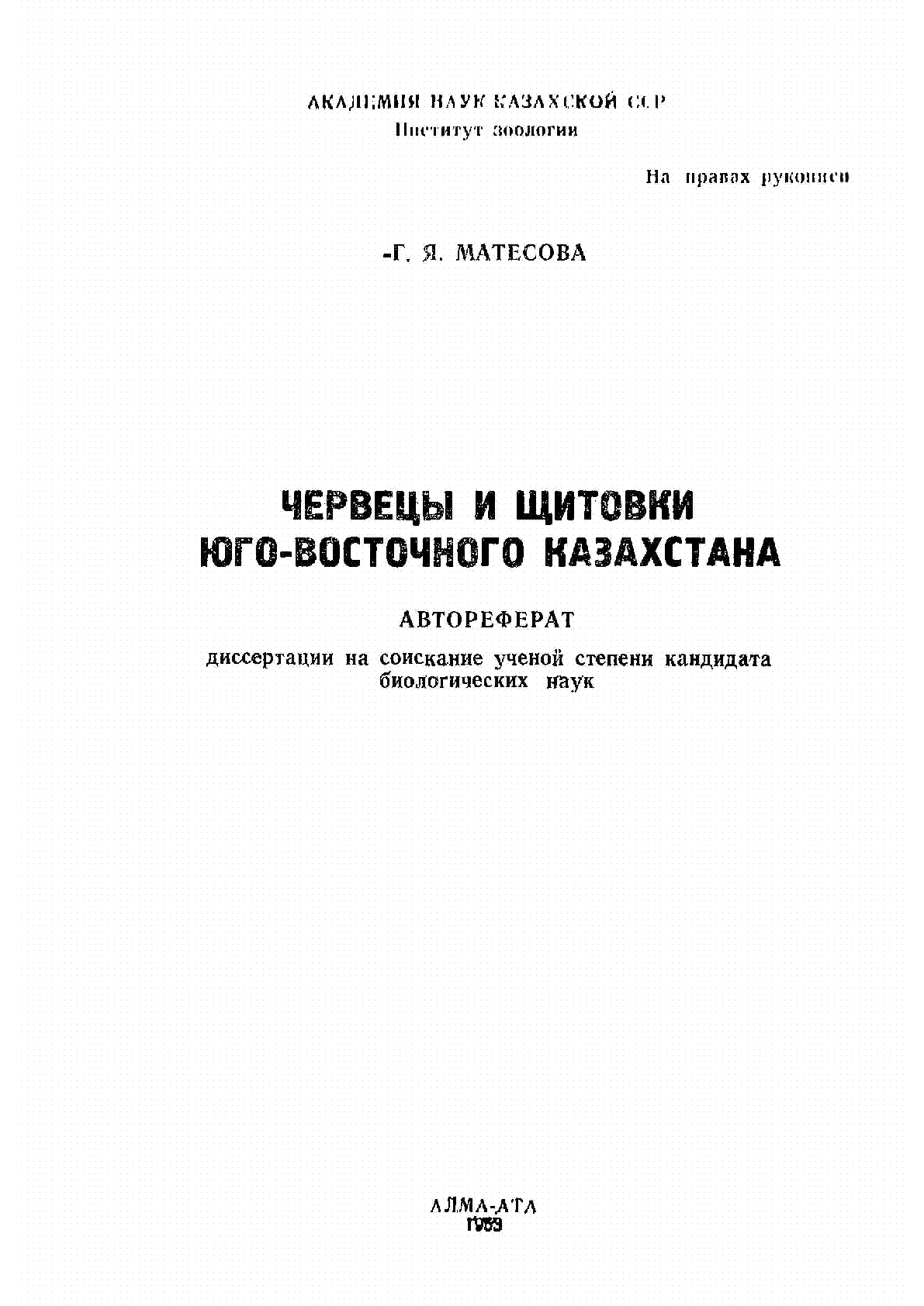 Червецы и щитовки Юго-Восточного Казахстана [Текст] : Автореферат диссертации на соискание ученой степени кандидата биологических наук / Г. Я. Матесова ; Академия наук Казахской ССР, Институт зоологии. – Алма-Ата [Алматы] ., [Б. м.]. – 10, [1] с. - Работа выполнялась в лаборатории энтомологии Института зоологии Академии наук Казахской ССР в течение 1950— 1953 гг. .Диссертация оформлена на 295 стр. машинописи, с 57 таблицами .оригинальных рисунков, с четырьмя таблицами цифрового материала и состоит из введения, общей и специальной частей . . – [б. т]