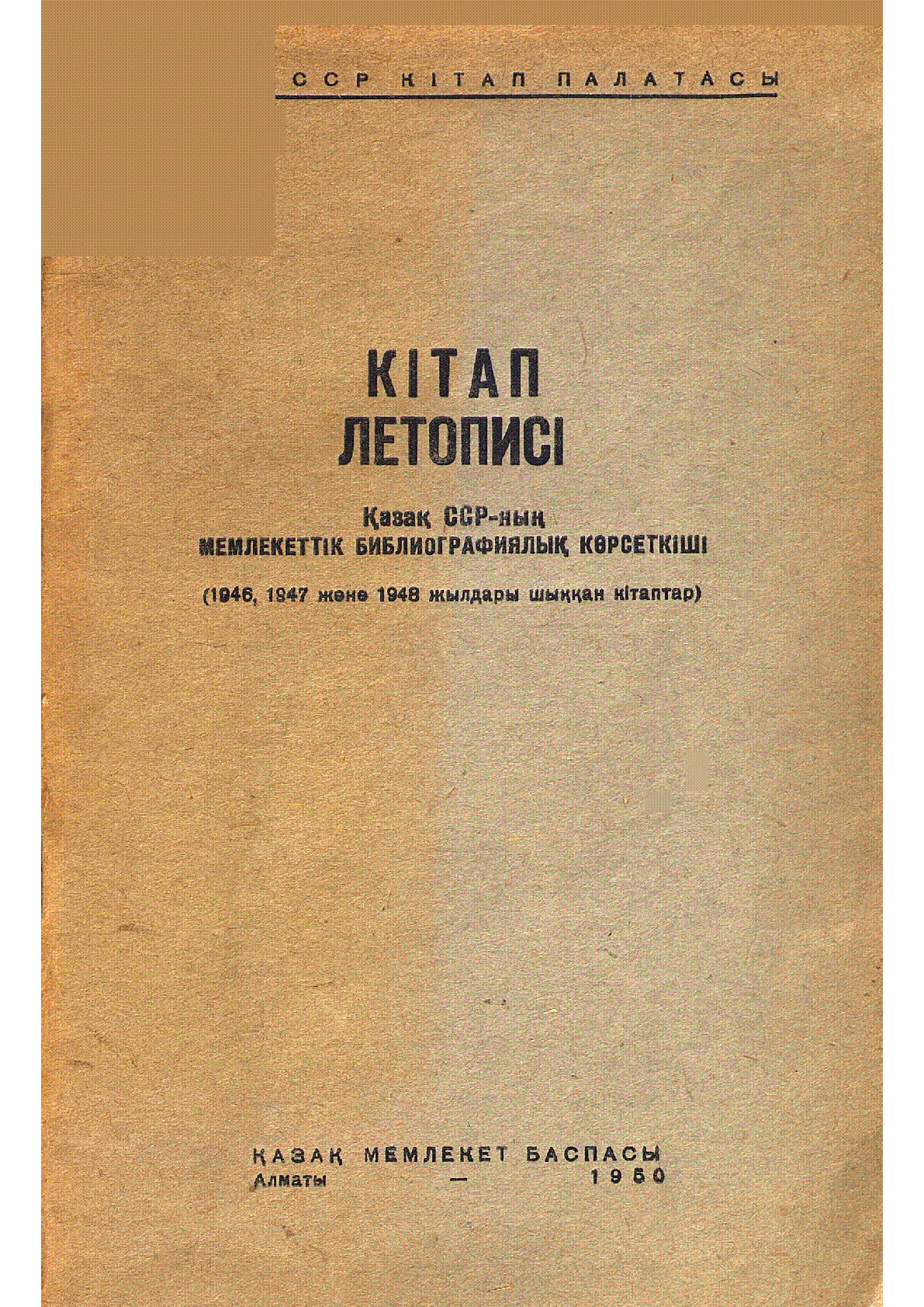 Кітап летописі [Мәтін] : Қазақ ССР-ның мемлекеттік библиография тілі : (1946-1948 жылдары шыққан кітап) / ; Қазақ ССР Кітап палатасы ; [құрастырған және редакциясын қараған С. Есова]... – Алматы : Қазақ мемлекет баспасы, 1950. - 37, [2] б. . . – 500 дана