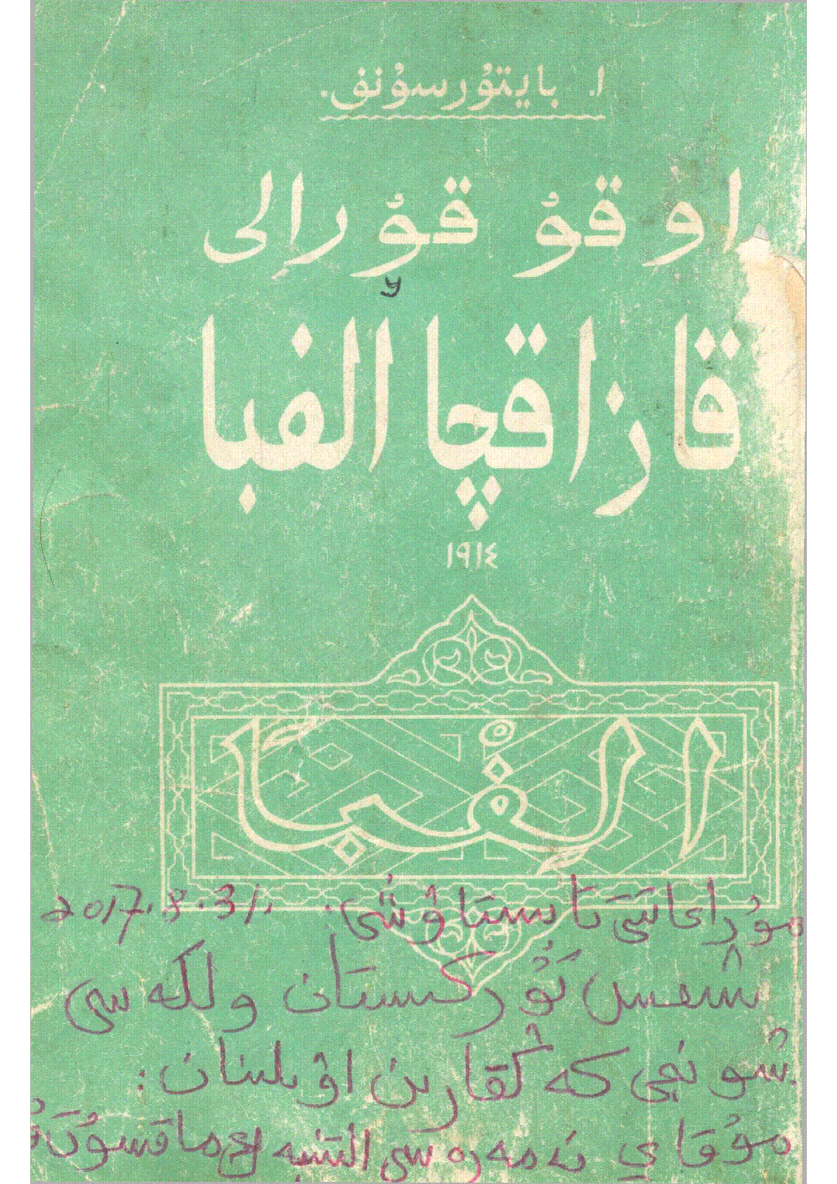 Қазақша алифбе = قازاقچا الفبا [Мәтін] : оқу құралы / А. Байтұрсынов ... – Орынбор : [б. ж.], 1914. - 99 б. - Бішкекте қайта басылып шыққан. - Араб графикасымен қазақ тілінде . . – 5000 дана