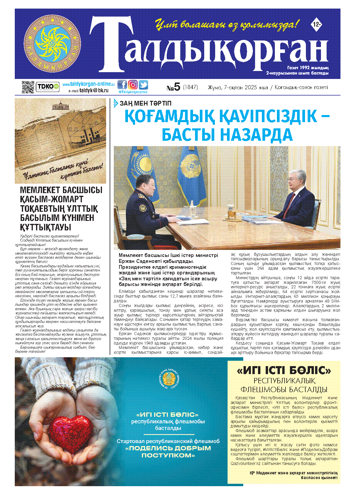 Талдықорған [Мәтін] : қоғамдық-саяси газеті : газет 1992 жылдың 2 наурызынан шыға бастады ; [меншік иесі "Талдықорған таңы" ЖШС ; директор-бас редактор Г. М. Нұршанова]. – Талдықорған : "Офсет" баспаханасы, 2025. - .– 5050 дана.– Аптасына 1 рет шығады. №5 (1847). - 5050 дана