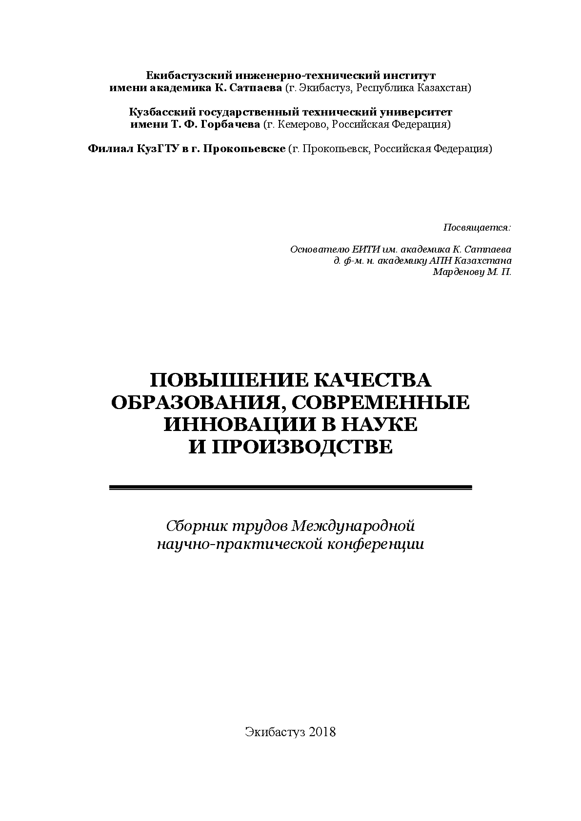 Повышение качества образования, современные инновации в науке и производстве [Текст] : сборник трудов Международной научно-практической конференции / ; Екибастузский инженерно-технический институт имени академика К. Сатпаева (г. Экибастуз, Республика Казахстан) ; Кузбасский государственный технический университет имени Т. Ф. Горбачева (г. Кемерово, Российская Федерация) ; Филиал КузГТУ в г. Прокопьевске (г. Прокопьевск, Российская Федерация) ; [ответственный за выпуск: Е. Ю. Пудов]... – Экибастуз : издательство филиала КузГТУ в г. Прокопьевске, 2018. - 534 с., ил.; - Текст на русском, казахском языке . – Список литературы в конце статей . – 300 экз. – ISBN 978-5-6040382-4-6