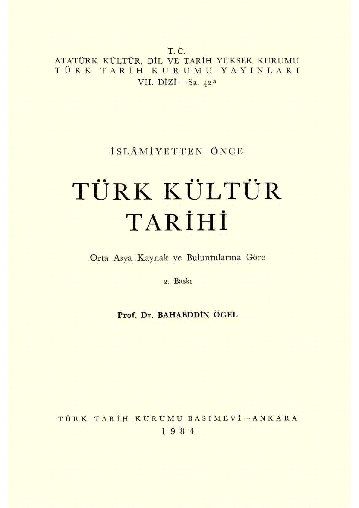 İslâmiyetten önce Türk kültür tarihi : Orta Asya kaynak ve buluntularına göre [Text] / B. Ögel ; Atatürk Kültür, Dil ve Tarih Yüksek Kurumu, Türk Tarih Kurumu. – 2. baskı .. – Ankara : Türk tarihi kurumu, 1984. - XX, 403 s., res., maps (1 folded), charts (3 folded) ;– (Atatürk Kültür, Dil ve Tarih Yüksek Kurumu. Türk Tarih Kurumu yayınları. ; VII. Dizi, Sayı 42 . – Includes biliographical references and index . – [d. y.]