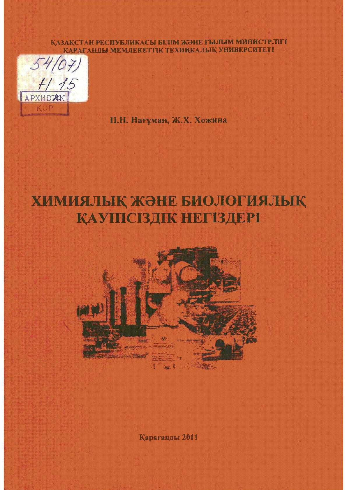 Химиялық және биологиялық қауіпсіздік негіздері [Мәтін] : оқу құралы / П. Н. Нағұман Ж. Х. Хожина ; Қазақстан Республикасы білім және ғылым министрлігі ; Қарағанды мемлекеттік техникалық университеті ; [аудармашы Г.Г. Нұрсейітова]... – Қарағанды : [б. ж.], 2011. - 89, [1] б. . – Библиографиялық тізім: 90 б. . – 50 дана – ISBN 978-601-296-088-4