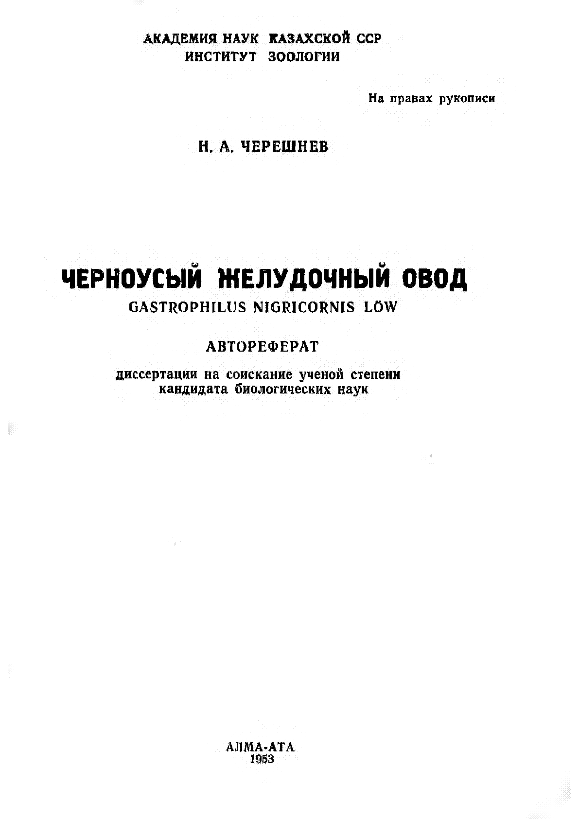 Черноусый желудочный овод Gastrophilus nigricornis Löw [Текст] : автореферат диссертации на соискание ученой степени кандидата биологических наук / Н. А. Черешнев ; Академия наук Казахской ССР ; Институт зоологии... – Алма-Ата [Алматы] : [б. и.], 1953. - 12 с. . .
