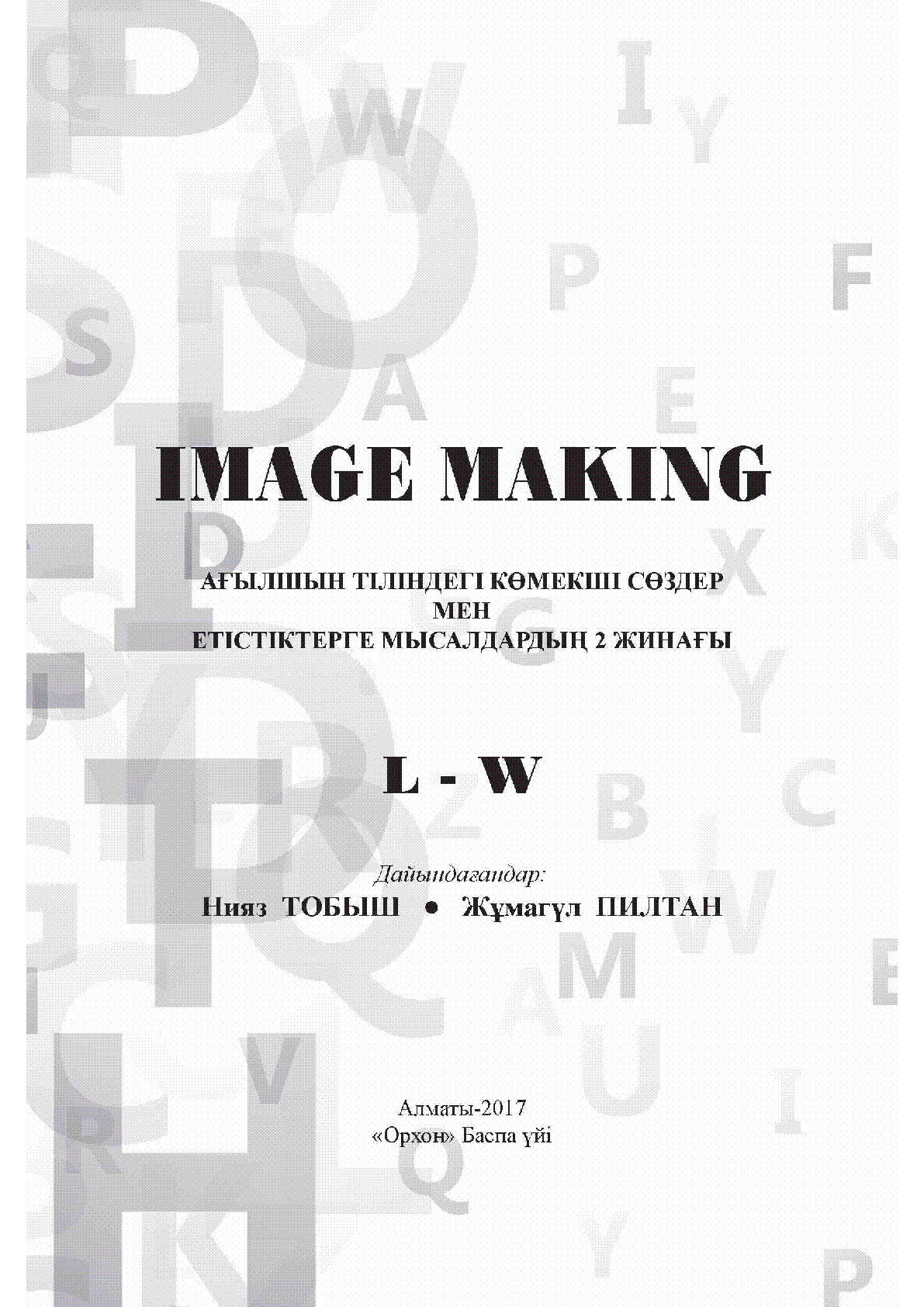 Image Making [Text] : мұғалімдерге көмекші құpaл ; [дайындағандар: Н. Тобыш, Ж. Пилтан] .- Алматы : "Орхон" Баспа үйі , 2017.– 200 дана . – ISBN 978-601-7403-86-7 - Мәтін ағылшын тілдерінде . 2-том . Ағылшын тіліндегі көмекші сөздер мен етістіктерге мысалдардың 2 жинағы. L-W– 464 б.