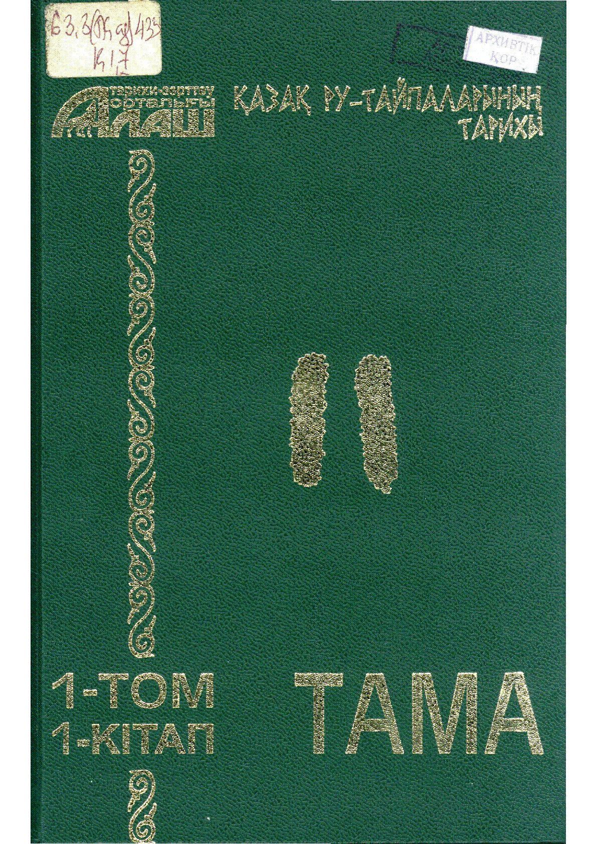 Қазақ ру-тайпаларының тарихы ; Ғабжалилов Х.М., Омарбеков Т., Кәрiбаев Б.Б. ж.б.; Карта-схема: Қартаева Т.Е., Бекмұратов А.Б.; Тарихи-топогр.этникалығ,есiмдер кәрсеткiштерi: Арепова А.Д., өмiрбекова Ж.М.- Алматы : "Алаш" тарихи-зерттеу орталығы , 2005. – "Алаш" тарихи-зерттеу орталығы.– 3000 дана . – 9965-765-01-4 - Мәтін қазақ, орыс тiлдерiнде. . 1-том, Бірінші кітап . Тама– 364 б., сур. .