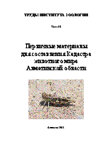 Первичные материалы для составления Кадастра животного мира Алматинской области = Алматы облысының жануарлар әлемінің Кадастріне мәліметтер = Primary materials for the drawing up of the Cadastre of fauna of Almaty area [Текст] / М. Х. Байжанов Ж. М. Жатканбаева А. М. Мелдебеков А. Бекенов Н. С. Кан ; М-во образования и науки РК ; Ин-т зоологии МОНРК ; [гл. ред. А. М. Мелдебеков ; редкол.: В. Л. Казенас [и др.]]... – Алматы : [б. и.], 2011. - 595 с.– (Труды института зоологии. ; Т. 52- 20-летию Независимости Республики Казахстан посвящается . . – 100 экз. – ISBN 978-601-278-542-5 : 10 тг.