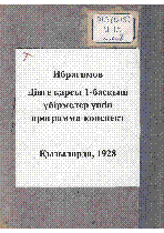 Дінге қарсы 1-басқыш үйірмелер үшін программа-конспект = دىنگە قارسى 1-باسقىش ۇيىرمەلەر ءۇشىن پىروعىرام-كانسپەك [Мәтін] / Ибрагимов ... – Қызылорда : Қазақстан баспасы, 1928. - 63 б. 16,5х12 см – (Қазақстандық өлкелік партия комитетінің үгіт-насихат бөлімі. - Мәтін араб графикасымен жазылған. . . – 4000 дана : 15 тиын
