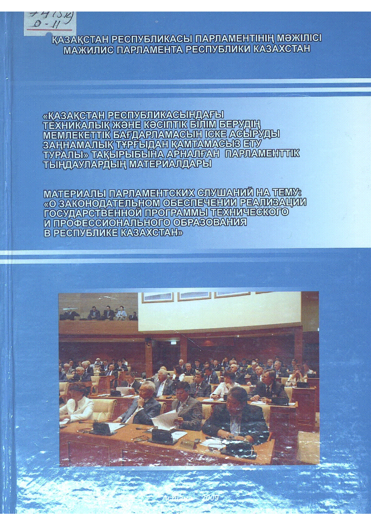 "Қазақстан Республикасындағы техникалық және кәсіптік білім берудің Мемлекеттік бағдарламасын іске асыруды заңнамалық тұрғыдан қамтамасыз ету туралы" тақырыбына арналған парламенттік тыңдаулардың материалдары = Материалы Парламентских слушаний на тему: "О законодательном обеспечении реализации Государственной программы технического и профессионального образования в Республике Казахстан" [Мәтін] / ; [жалпы ред. басқ.: О. Б. Мұхамеджанов, Ж. С. Кәрібжанов] ; жауапты шығ. Қ. А. Бисенов ; Қазақстан Республикасы Парламентінің Мәжілісі ; Әлеуметтік-мәдени даму комитеті... – Астана : [б. ж.], 2009. - 151, [3] б., [8] п. сурет; - Мәтін қаз., орыс тілд. . . – [т.ж] (мұқ.) : 260 тг.