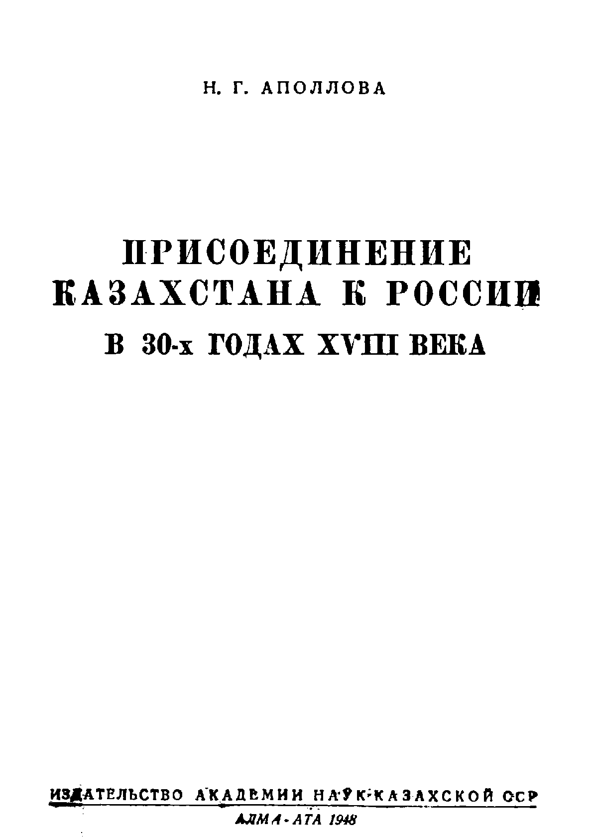 Присоединение Казахстана к России в 30-х годах XVIII века [Текст] / Н. Г. Аполлова ; [отв. ред. Е. Бекмаханов ; ред. С. Г. Медведев] ; Акад. наук КазССР... – Алма-Ата : Издательство Академии наук Каз ССР, 1948. - 253, [2] с. . – Библиогр. в подстроч. примеч. . – 2000 экз. (в пер.) : 50 тг.