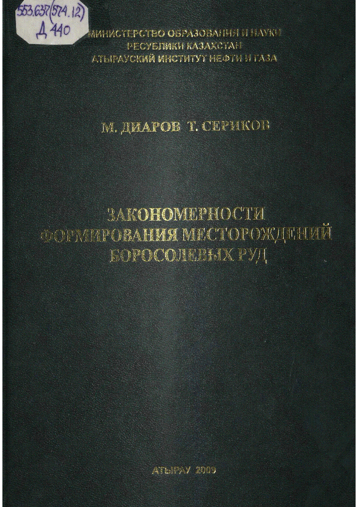 Закономерности формирования месторождений боросолевых руд [Текст] / М. Д. Диаров Т. П. Сериков ; М-во образования и науки Республики Казахстан, Атырауский ин-т нефти и газа. – Изд. 2-е ., доп.. – Алматы : Эверо, 2010. - 257 с., табл., ил.; . – Библиогр.: с. 252-255 . – 200 экз. – 9965-474-17-6 (в пер.) : 550 тг.