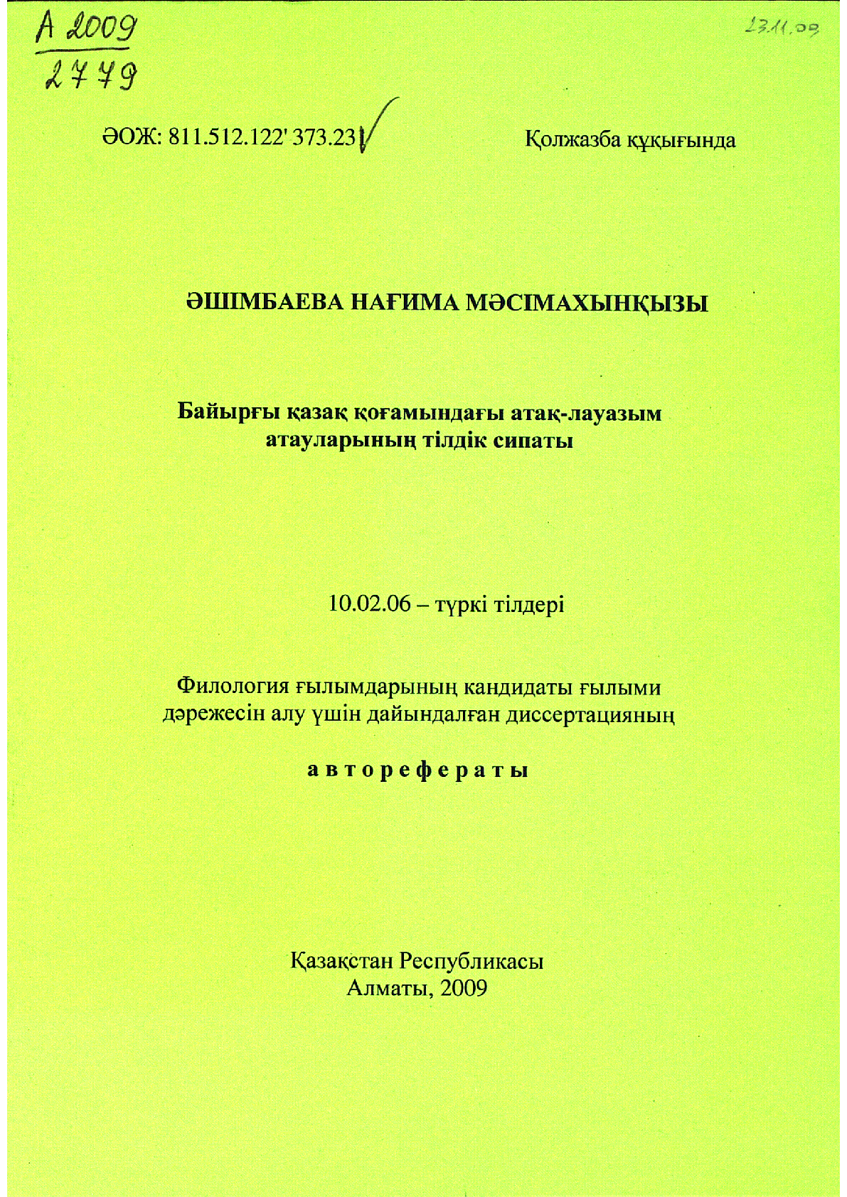 Байырғы қазақ қоғамындағы атақ-лауазым атауларының тілдік сипаты [Мәтін] : Филология ғылымдарының кандидаты ғылыми дәрежесін алу үшін дайындалған дисс. авторефераты. 10.02.06 мамандығы бойынша / Әшімбаева, Нағима Мәсімахынқызы ... – Алматы : [Б. ж.], 2009. - 29, [7] б. . – Библиогр.: б. 28 . – 100 дана – көрсетілмеген : [Б. ж.]