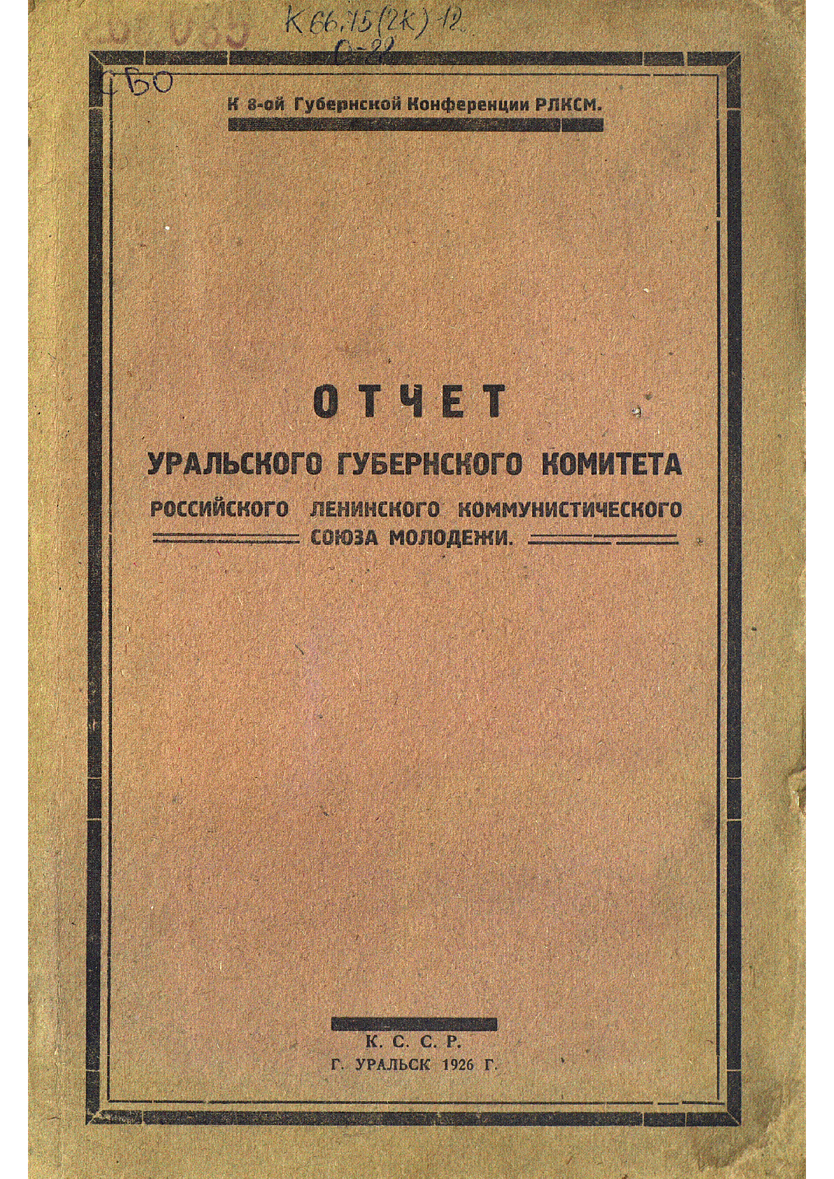 Отчет Уральского Губернского Комитета Российского Ленинского Коммунистического Союза Молодежи [Текст] : К 8-ой Губернской Конференции РЛКСМ / ... – Уральск : [Б. и.], 1926. - 39 с. - Загл. с обложки . .
