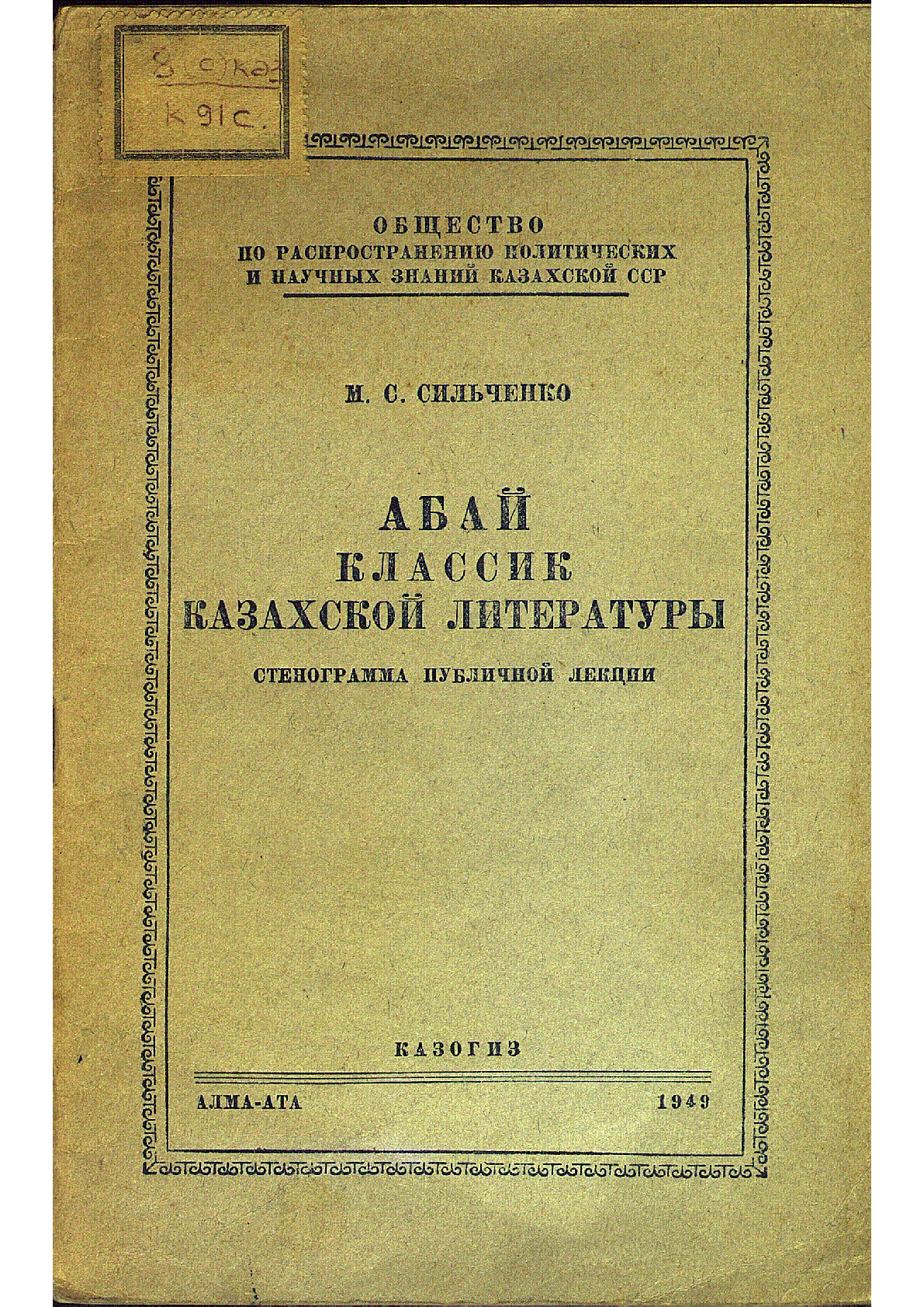 Абай - классик казахской литературы [Текст] : стенограмма публичной лекции / М. С. Сильченко ; Общество по распространению политических и научных знаний КазССР... – Алма-Ата : КазОГИЗ, 1949. - 29, [1] с. - Шора Сарыбаев қоры . . – 10000 экз. : 20 тг.