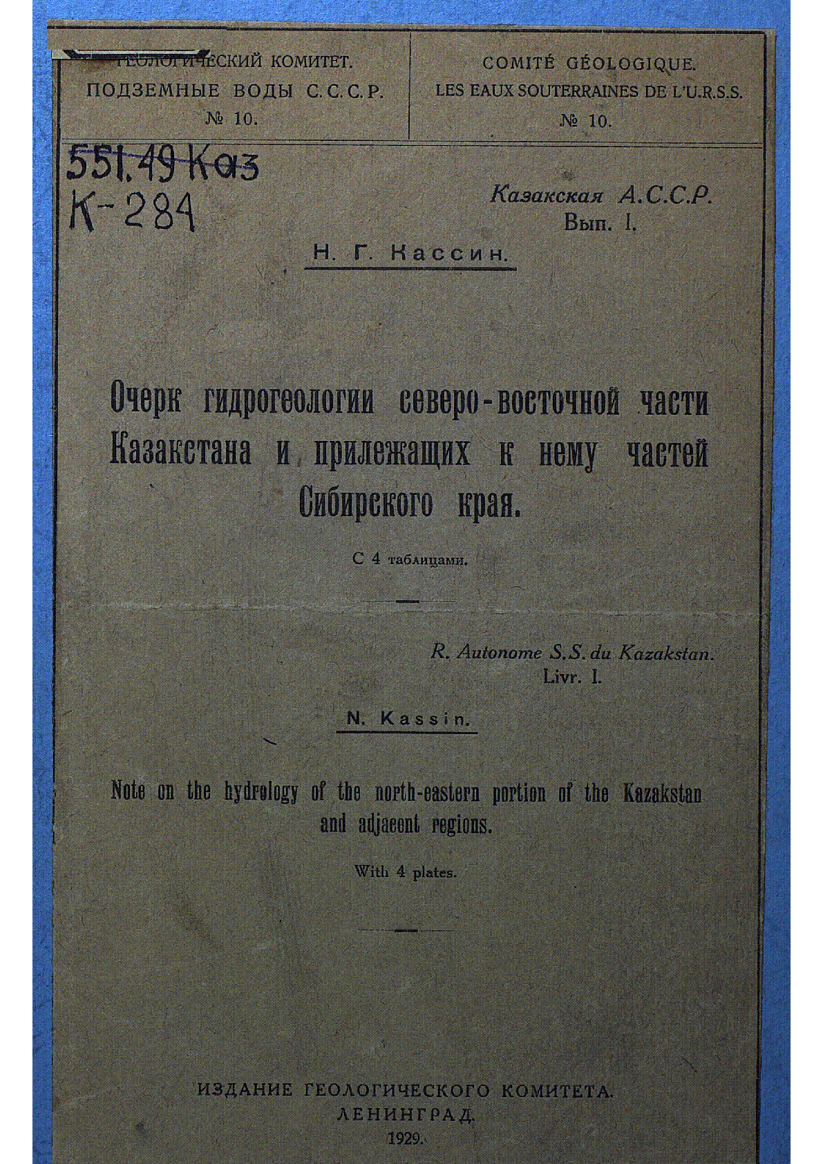 Очерк гидрогеологии северо-восточной части Казакстана и прилежащих к нему частей Сибирского края [Текст] : с 4 табл. / Н. Г. Кассин- Л. : Издание геологического комитета , 1929. – Подземные воды СССР. № 10 : Казакская АССР) .– 1500 экз. . Вып. 1 .– 47 с., [4] табл. .