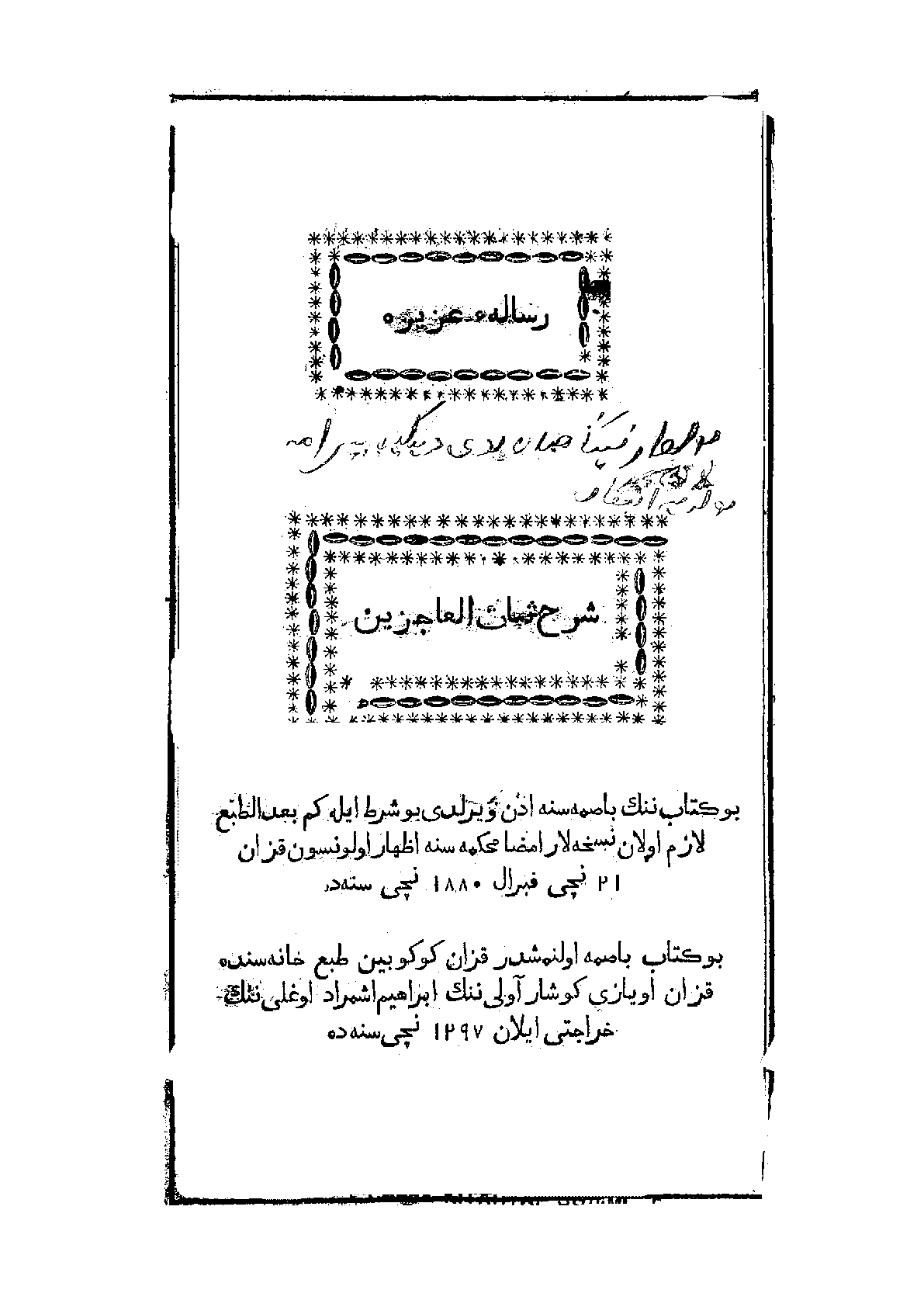 Шағатайша жазылған діни өсиет және хикаялар кітабы [Text] / А. Рисәләт ... – [Б. м.] : [б. и.], 1880. - [350] б. . .