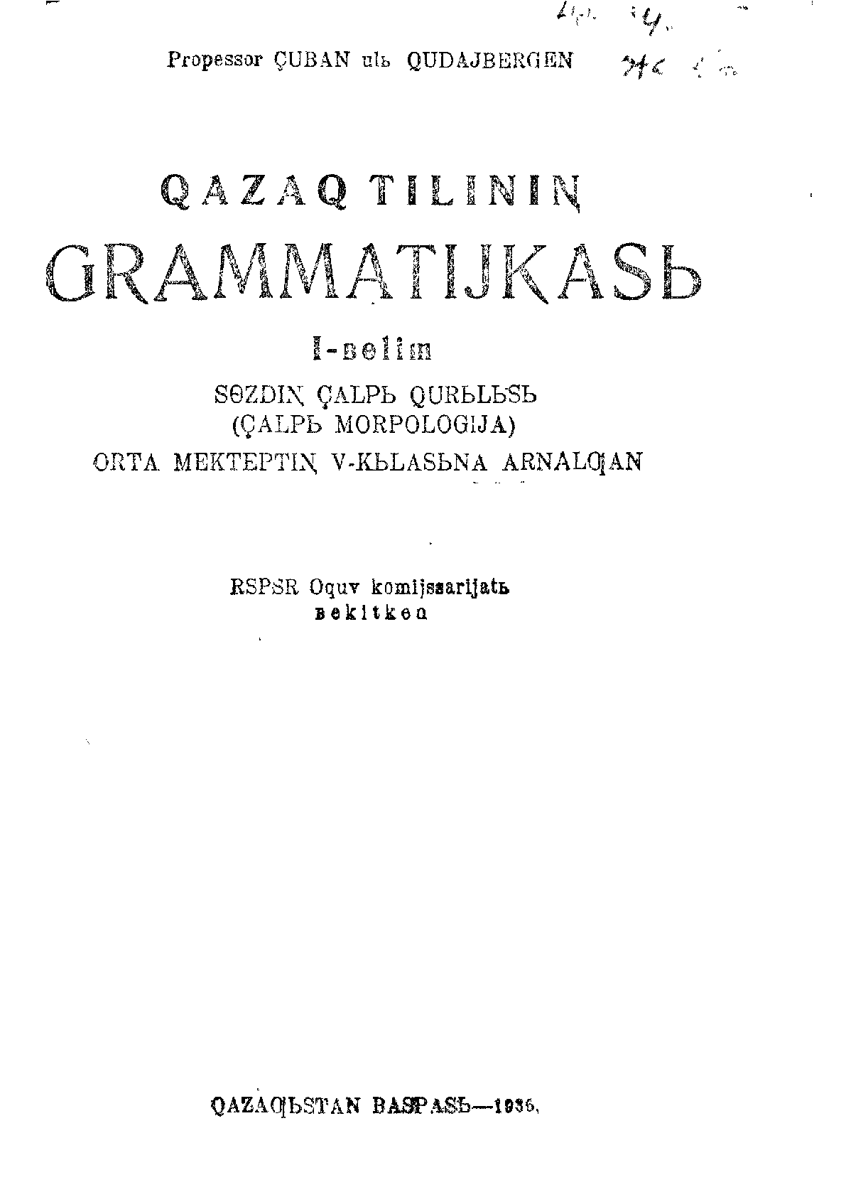 Қазақ тілінің грамматикасы [Мәтін] : орта мектептің 5 класына арналған / Қ. Қ. Жұбанов ; РСПСР оқу комиссариаты бекіткен .- Алма-Ата [Алматы] : Қазақстан баспасы , 1936.– 30160 дана . - Мәтін латын қарпымен қазақ тілінде. - Титулдық бетте "Qazaq tiliniƞ grammatijkasь" . 1 бөлім . Сөздің қалпы құрылысы (қалпы морфология)– 74 б.