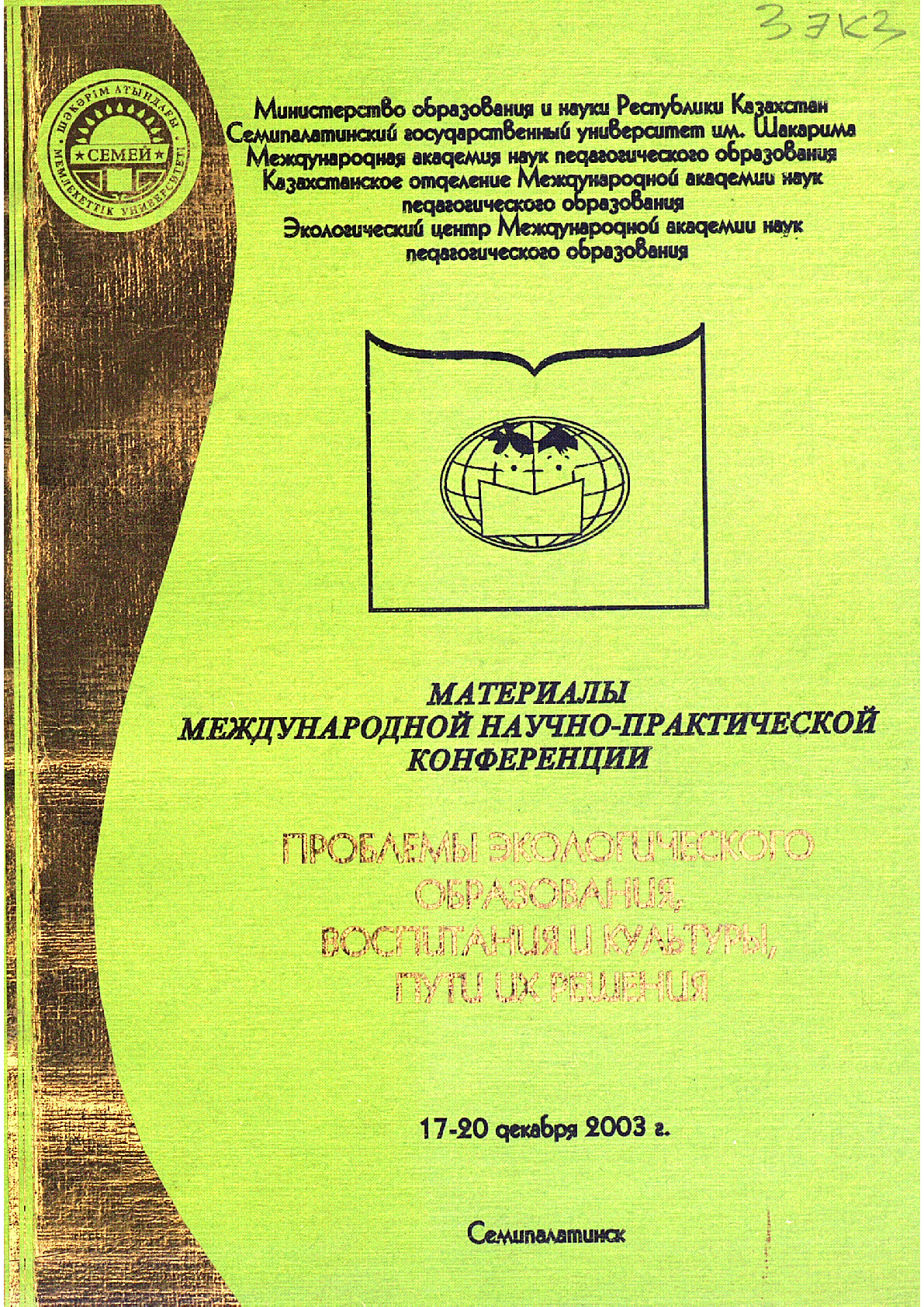 Проблемы экологического образования, воспитания и культуры, пути их решения = Problems of Ecological Education and Culture, Ways of Solution : Материалы международной научно-практической конференции (17-20 дек. 2003 г.) / ... – Семей : СГУ им. Шакарима, 2003. - 317 с., ил.; - Текст на рус. и каз. языках . . – 9965-623-33-3