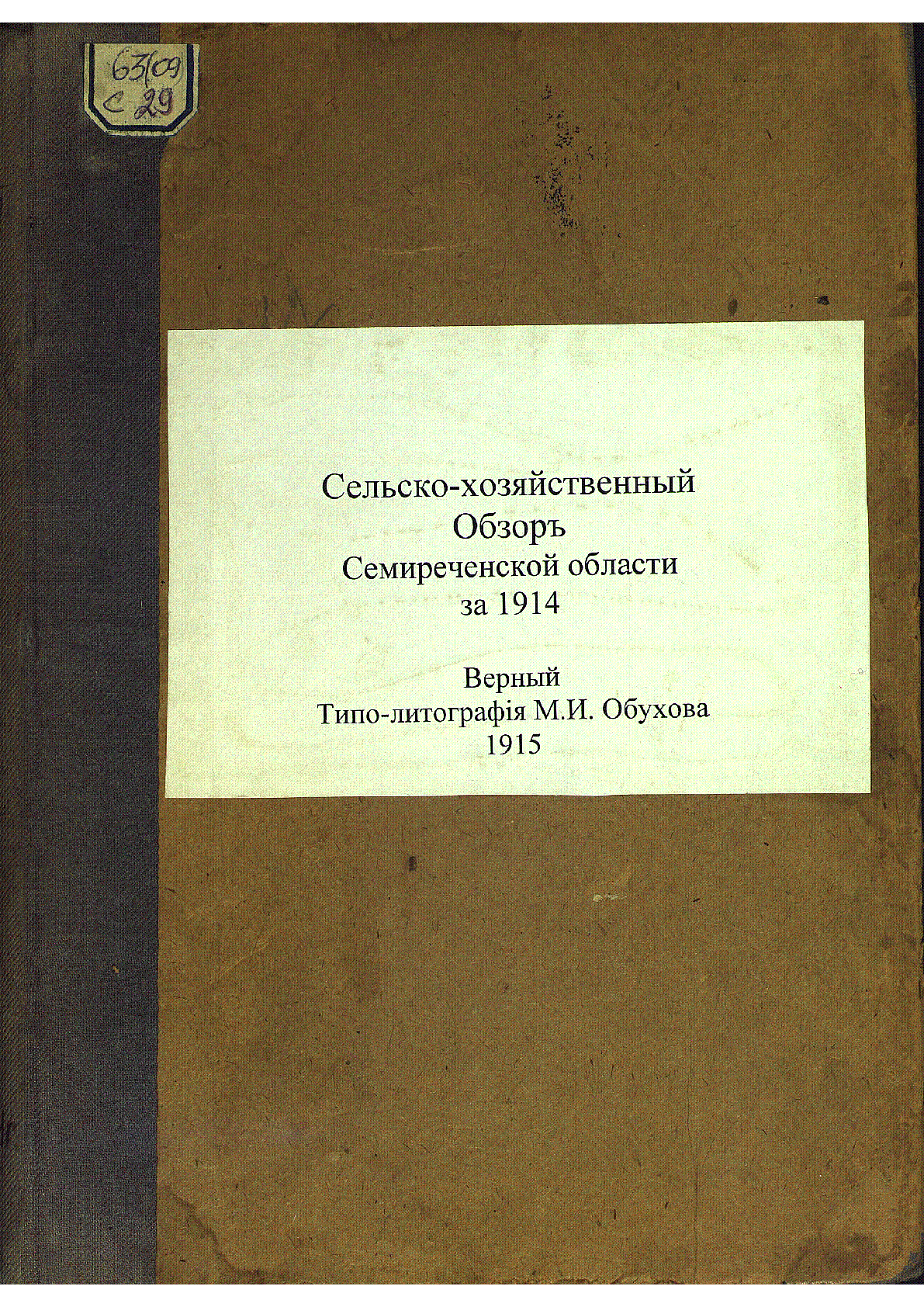 Сельско-хозяйственный Обзоръ Семиръченской области за 1914 годъ [Текст] : Съ прил. 3 діаграммъ / ... – Върный : Типо-Лит. М. И. Обухова, 1915. - II, 240 c., [3] л. ил., ил., табл.; . .