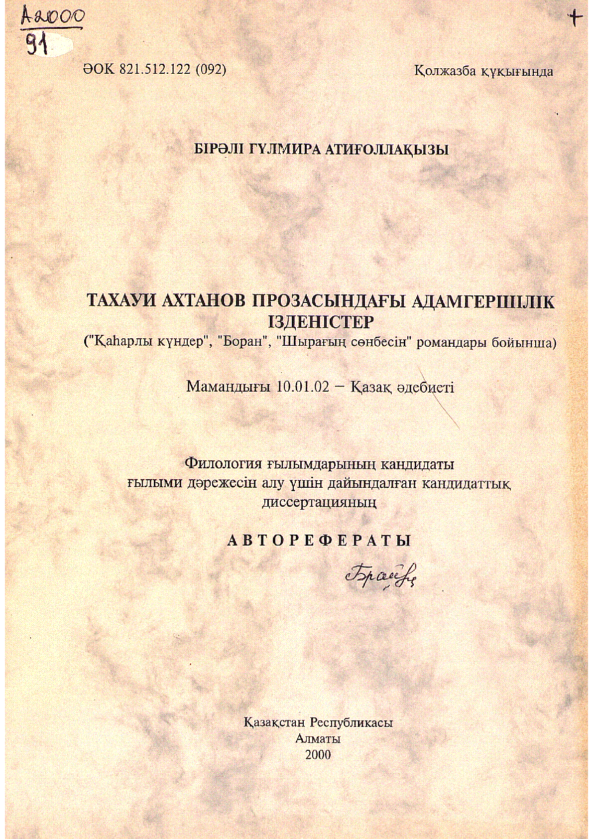 Тахауи Ахтанов прзасындағы адамгершілік ізденістер : Филология ғылым. канд. ғылыми дәреж. алу үшін дайындал. дисс. авторефераты мамандығы бойынша 10.01.02- қазақ әдебиеті / Бірәлі, Гүлмира Атиғоллақызы ... – Алматы, 2000. - 30 б. . .