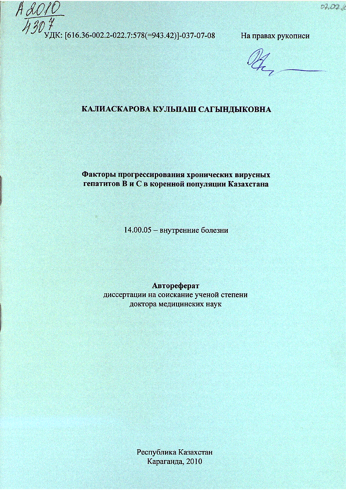 Факторы прогрессирования хронических вирусных гепатитов В и С в коренной популяции Казахстана : Автореферат дис. ... д-ра мед. наук : 14.00.05 / Калиаскарова, Кульпаш Сагындыковна ... – Караганда : [б.и.], 2010. - 24, [4] с., рис.; . – Библиогр.: с. 21-24 . – 120 экз. – не указан : [б.ц.]