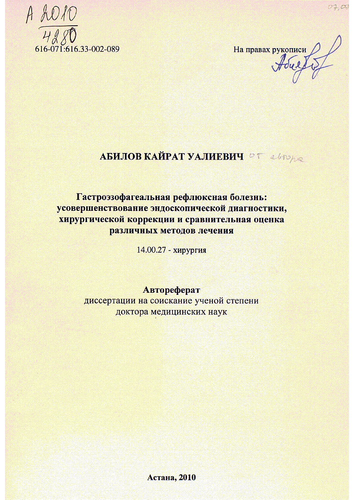 Гастроэзофагеальная рефлюксная болезнь: усовершенствование эндоскопической диагностики, хирургической коррекции и сравнительная оценка различных методов лечения : Автореферат дис. ... д-ра мед. наук : 14.00.27 / Абилов, Кайрат Уалиевич ... – Астана : [б.и.], 2010. - 40 с. . – Библиогр.: с. 34-36 . – 100 экз. – не указан : [б.ц.]