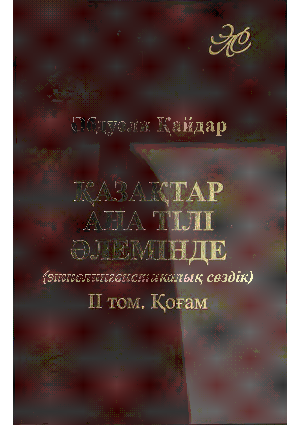 Қазақтар ана тілі әлемінде [Мәтін] : (этнолингвистикалық сөздік) / Ә. Қайдар ; [ред. Ж. Манкеева] .- Алматы : Сардар , 2013. – 978-601-7174-33-0, – 4000 дана . – 978-601-7174-34-7 (2-т.) (мұқ.) - ҚР Мәдениет және ақпарат министрлігі Тіл комитетінің тапсырысы бойынша "Қазақстан Республикасында тілдерді дамыту мен қолдаудың 2011-2020 жылдарға арналған мемлекеттік бағдарламасы" аясында шығарылды. - Марал Хасен қоры . Библиогр.: 718-724 б. 2-том . Қоғам– 724, [2] б. (мұқ.) : 3096 тг.