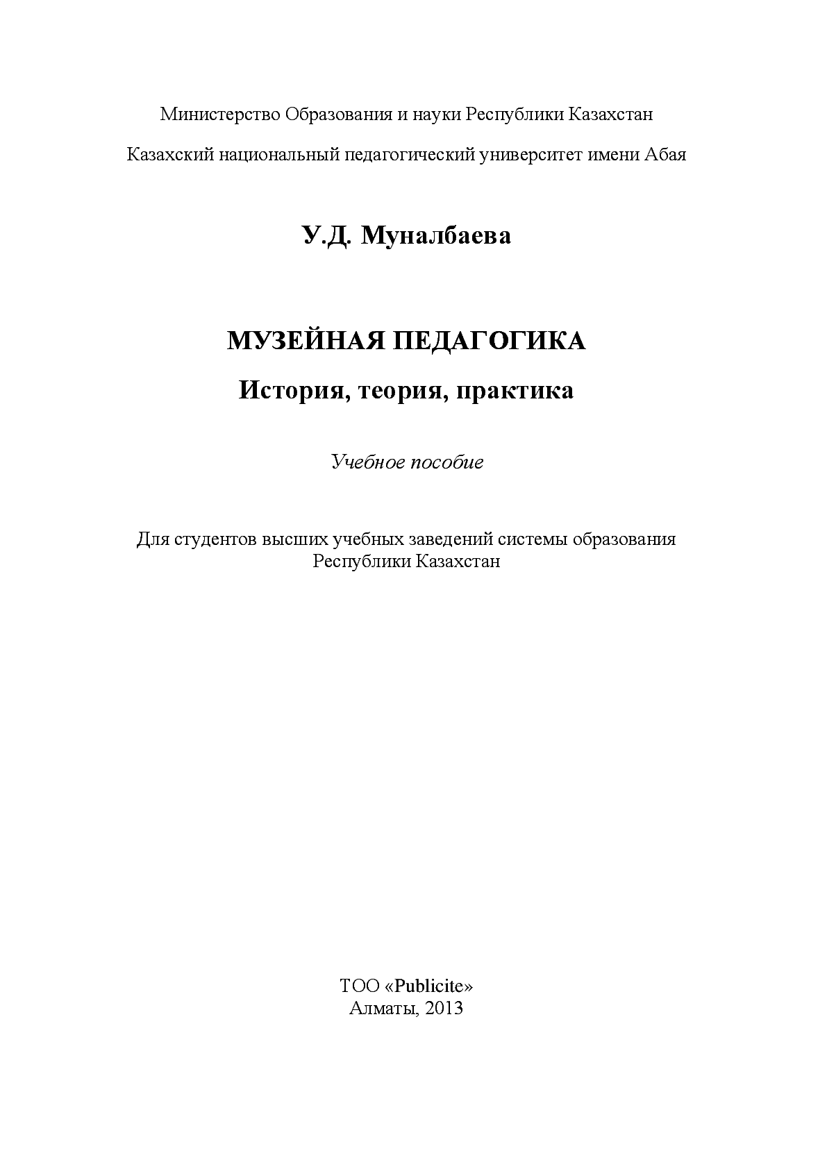 Музейная педагогика. История, теория, практика [Текст] : учебное пособие для студентов высших учебных заведений образования Республики Казахстан / У. Д. Муналбаева ; Министерство образования и науки Республики Казахстан, Казахский Национальный педагогический университет имени Абая ; [редактор А. А. Кульшанова]... – Алматы : Publicite, 2013. - 527 с., ил.; - Текст рус., каз. . – Библиогр.: с. 250-252 . – 500 экз. – ISBN 978-601-85233-1-6, ISBN 978-601-80233-1-6 : 40 тг.