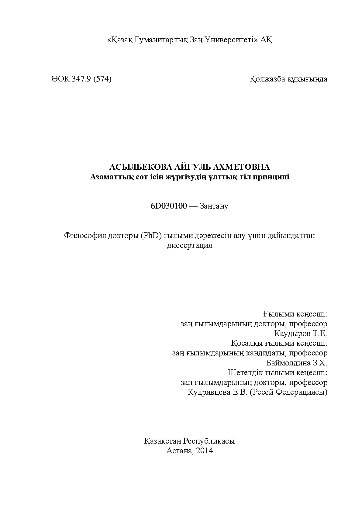 Азаматтық сот ісін жүргізудің ұлттық тіл принципі [Электрондық ресурстар], [Электрондық ресурстар] : Философия докторы (PhD) ғылыми дәрежесін алу үшін дайындалған диссертация / А. А. Асылбекова ... – Астана : [б. ж.], 2014. - электрон. мәлім, 1 электрон. опт диск (CD-ROM); 12 х 14 см . – Библиогр. 138-150 б. . – [т. ж.] : 100 тг.