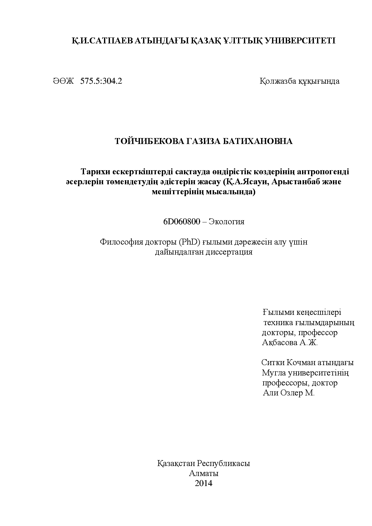 Тарихи ескерткіштерді сақтауда өндірістік көздерінің антропогенді әсерлерін төмендетудің әдістерін жасау (Қ.А.Ясауи, Арыстанбаб және мешіттерінің мысалында) [Электрондық ресурстар], [Электрондық ресурстар] : Филос. докторы (PhD) ғылыми дәрежесін алу үшін дайындалған диссертация / Г. Б. Тойчибекова ... – Алматы : [б. и.], 2014. - электрон. мәлім, 1 электрон. опт. диск (CD-ROM); 12 х 14 см . – Библиогр. 110-120 б. . – [т. ж.] : 100 тг.
