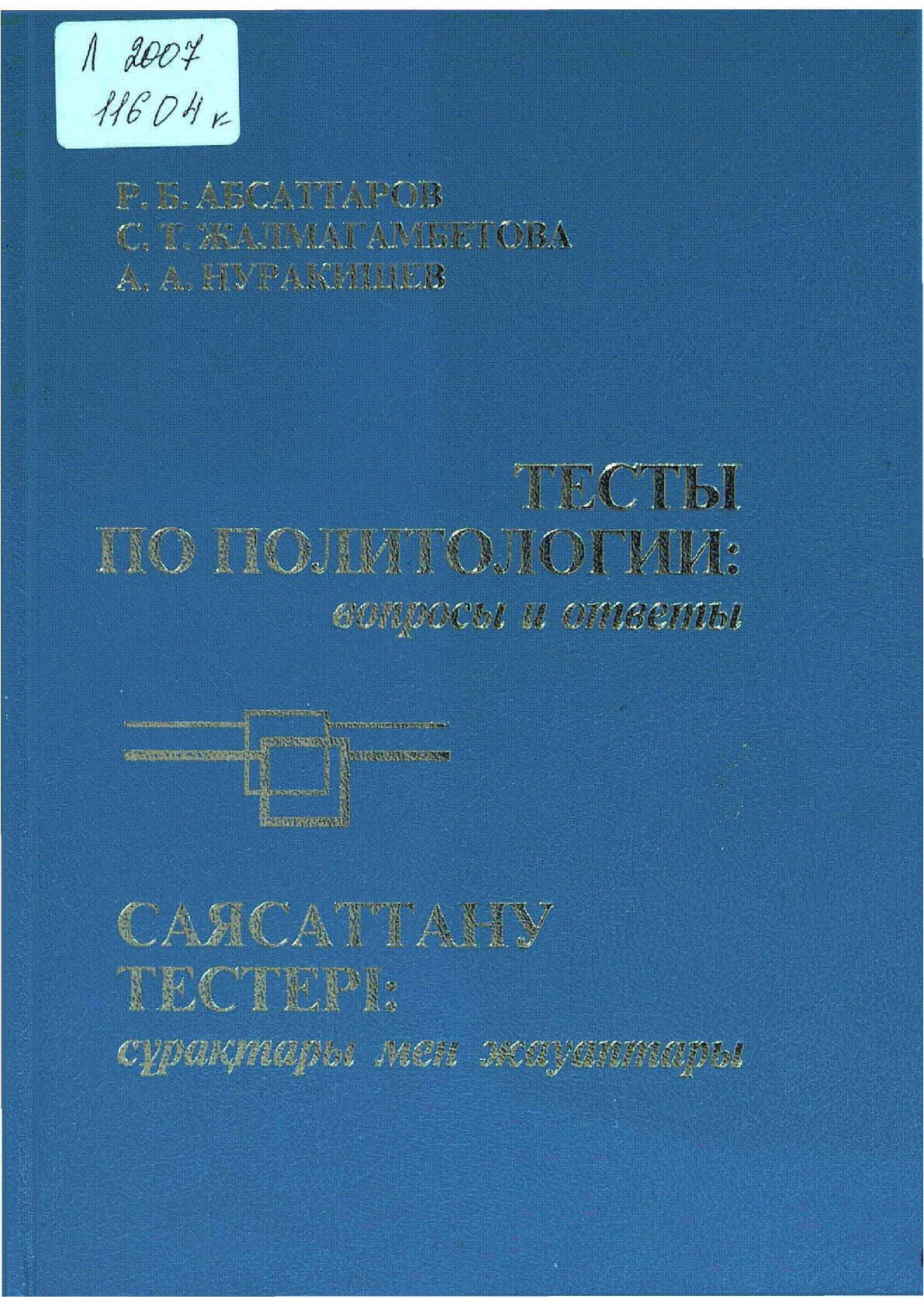 Тесты по политологии: вопросы и ответы = Саясаттану тестері: сұрақтары мен жауаптары [Текст] : [учебное пособие] / Р. Б. Абсаттаров Н. А. Нуракишев С. Т. Жалмагамбетова ... – Алматы : Ғылым, 2005. - 310 с. . . – 2500 экз. – 9965-07-366-Х (в пер.)