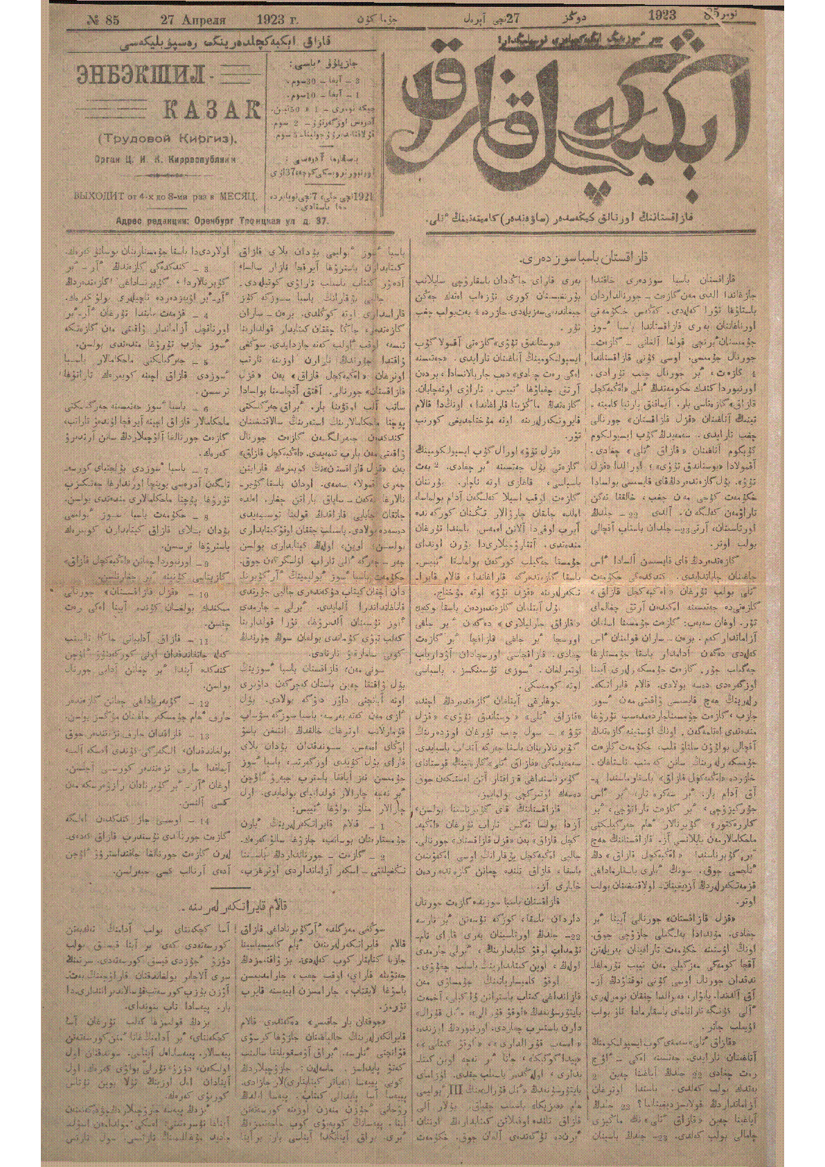 Еңбекшіл қазақ. 1923 ж. [Text] ; Қазақстанның орталық комитеті. – Орынбор, 1923. - – айына 4, 8 рет шығады.