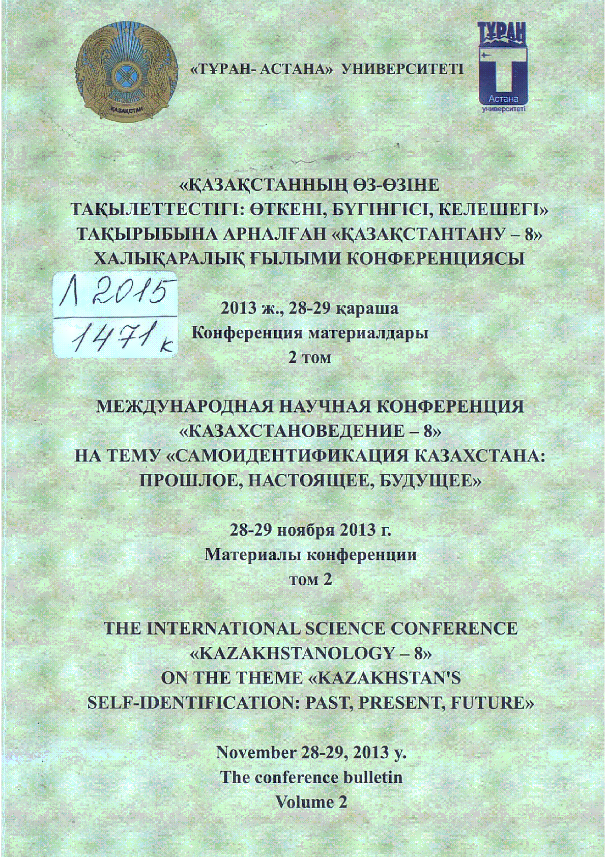 "Қазақстанның өз-өзіне тақылеттестігі: өткені, бүгінгісі, келешегі" тақырыбына арналған "Қазақстантану-8" халықаралық ғылыми конференциясы [Мәтін] ; [ред. алқа: У. Ж. Алиев [ж. б.]] ; Тұран-Астана университеті .- Астана : [б. ж.] , 2013.– 500 дана . – ISBN 978-601-214-222-8 - Мәтін қазақ, орыс, ағылш. тілд. . Библиогр. мақала соңында 2 т. . 2013 ж., 28-29 қараша. Конференция материалдары– 355 б. : 20 тг.