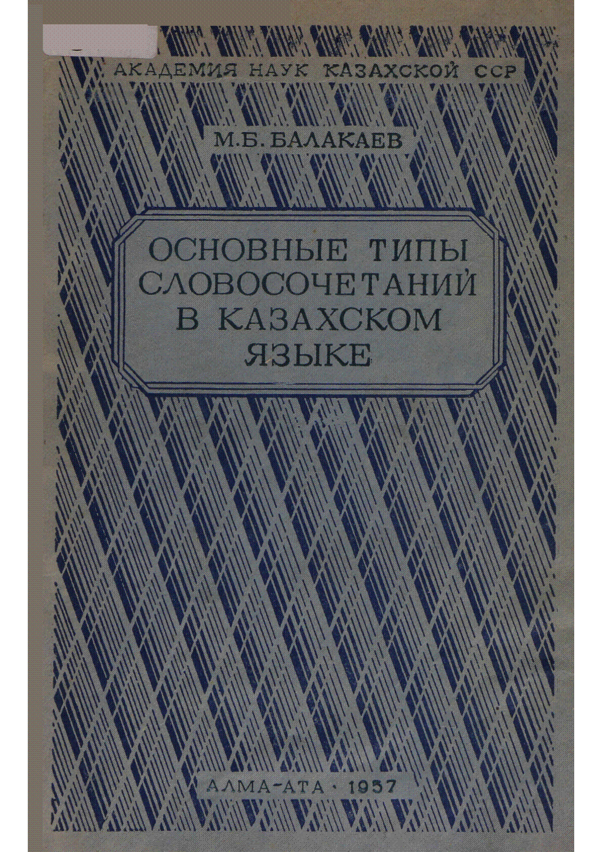 Основные типы словосочетаний в казахском языке [Текст] / М. Б. Балакаев ; Академия наук Казахской ССР, Институт языка и литературы ; Казахский государственный университет им. С. М. Кирова ; [отв. ред. С. К. Кенесбаев] ... – Алма-Ата : Издательство Академии наук Казахской ССР, 1957. - 122, [1] с. - Текст рус., каз. - Шора Сарыбаев қоры . . – 2550 экз. (в пер.) : 60 тг.