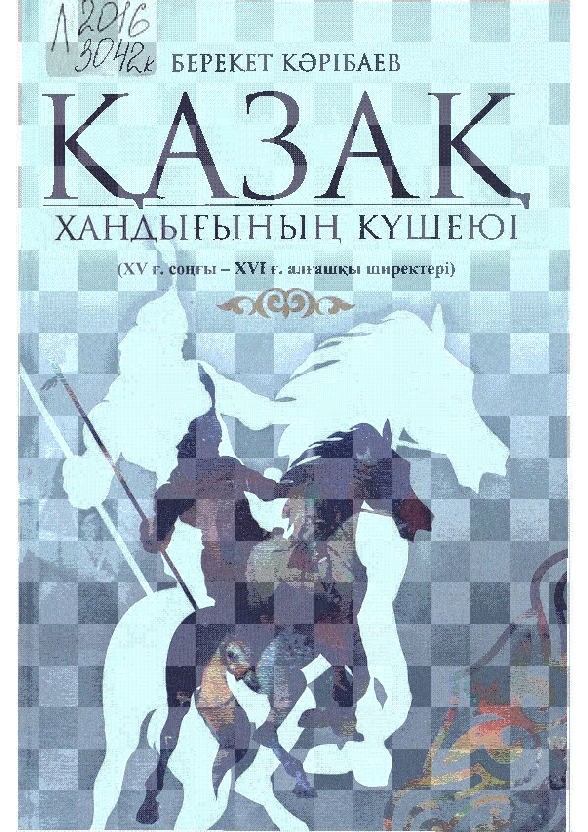 Қазақ хандығының күшеюі [Мәтін] : (XV ғ. соңғы - XVI ғ. алғашқы ширектері) / Б. Кәрібаев ... – Алматы : Сардар, 2016. - 173, [1] б. - "Мәдениет және өнер саласындағы бәсекелестікті жоғарылату қазақстандық мәдени мұраны сақтау, зерделеу мен насихаттау және мұрағат ісінің іске асырылу тиімділігін арттыру" бағдарламасы "Әдебиеттің әлеуметтік маңызды түрлерін басып шығару" кіші бағдарламасы бойынша жарық көрді . – Библиогр.: 148-156 б. ; қысқартулар: 157-158 б. ; қосымшалар: 159-173 б. . – 2000 дана – 978-601-7174-79-8 (мұқ.) : 990 тг.