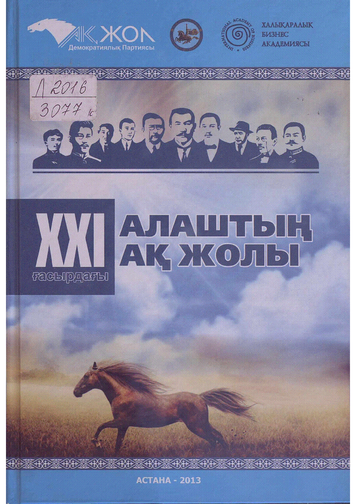 ХХІ-ғасырдағы Алаштың Ақ жолы [Мәтін] / ; Қазақстанның "Ақ жол" демократиялық партиясы ; авторы және редакторы С. Байдалы ; акылдасар алқасы: А. Перуашев [ж. б.]... – Алматы : Экономика, 2013. - 247 б., суретті; - Мәтін қазақ, орыс тілдерінде . – Библиография мақала соңында . – 2000 дана – ISBN 978-601-225-516-4 (мұқ.) : 40 тг.