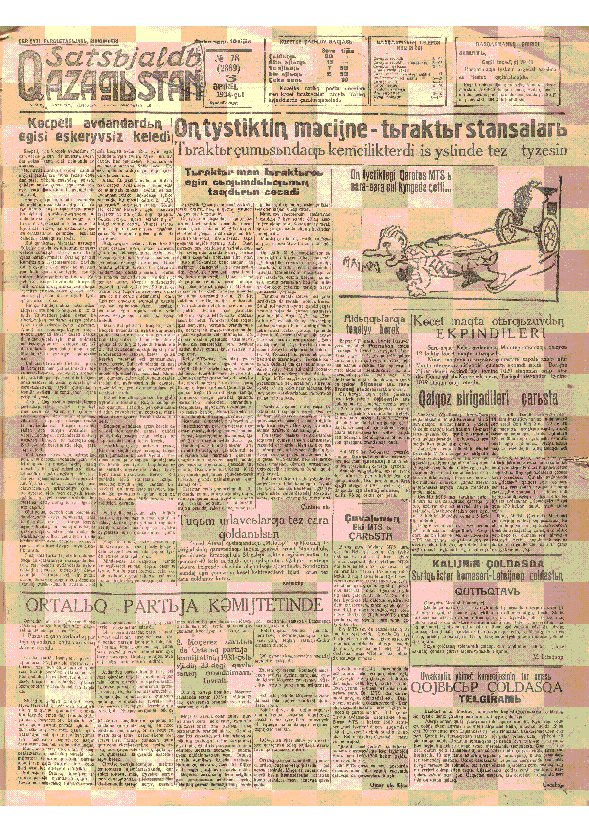 Социалды Қазақстан. 1934 ж. = Sozsialdь Qazaqьstan : 3-апрель, 1934 ж.. – Алматы : [Казместпром], 1934. - .– [т.ж.]. №78 (2889). - [т.ж.]