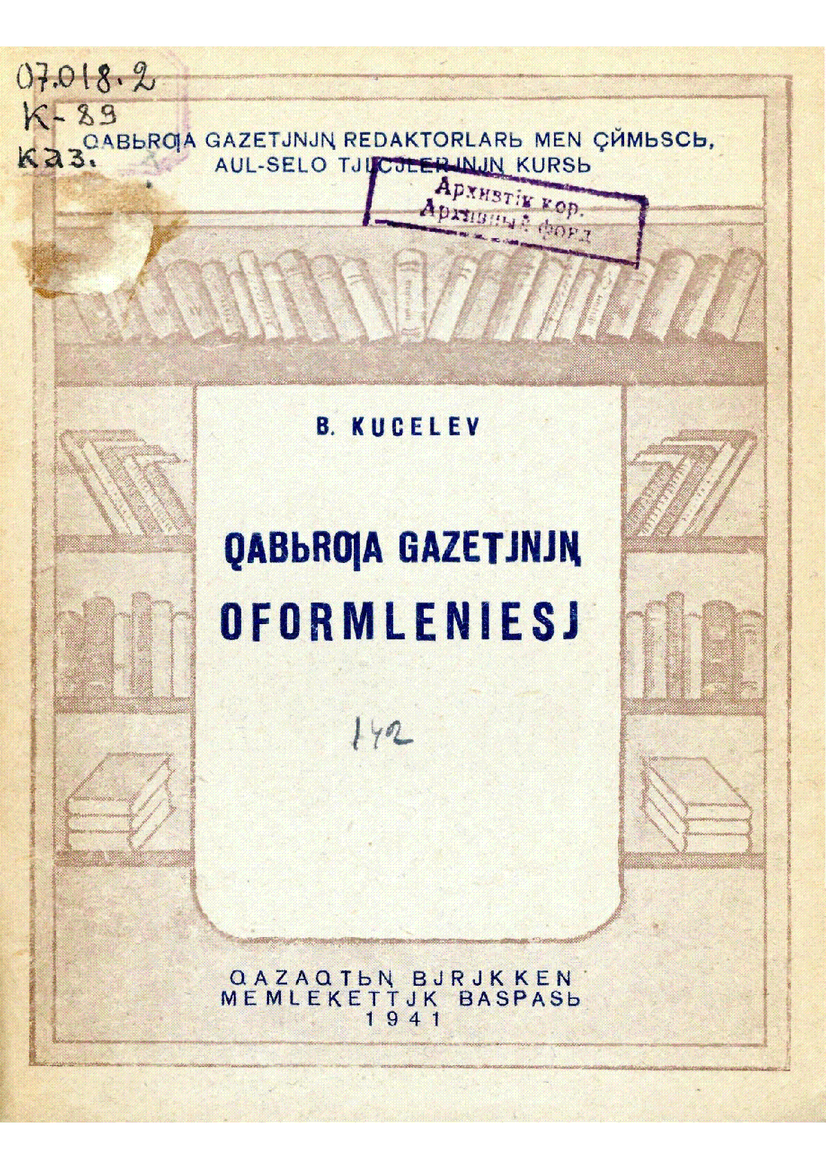 Қабырға газетінің оформлениесі [Text] / Кушелев Б. ... – Алма-Ата : Қазақтың біріккен мемлекеттік баспасы, 1941. - 56 бет - Латын графикасымен. . . – 3000 дана