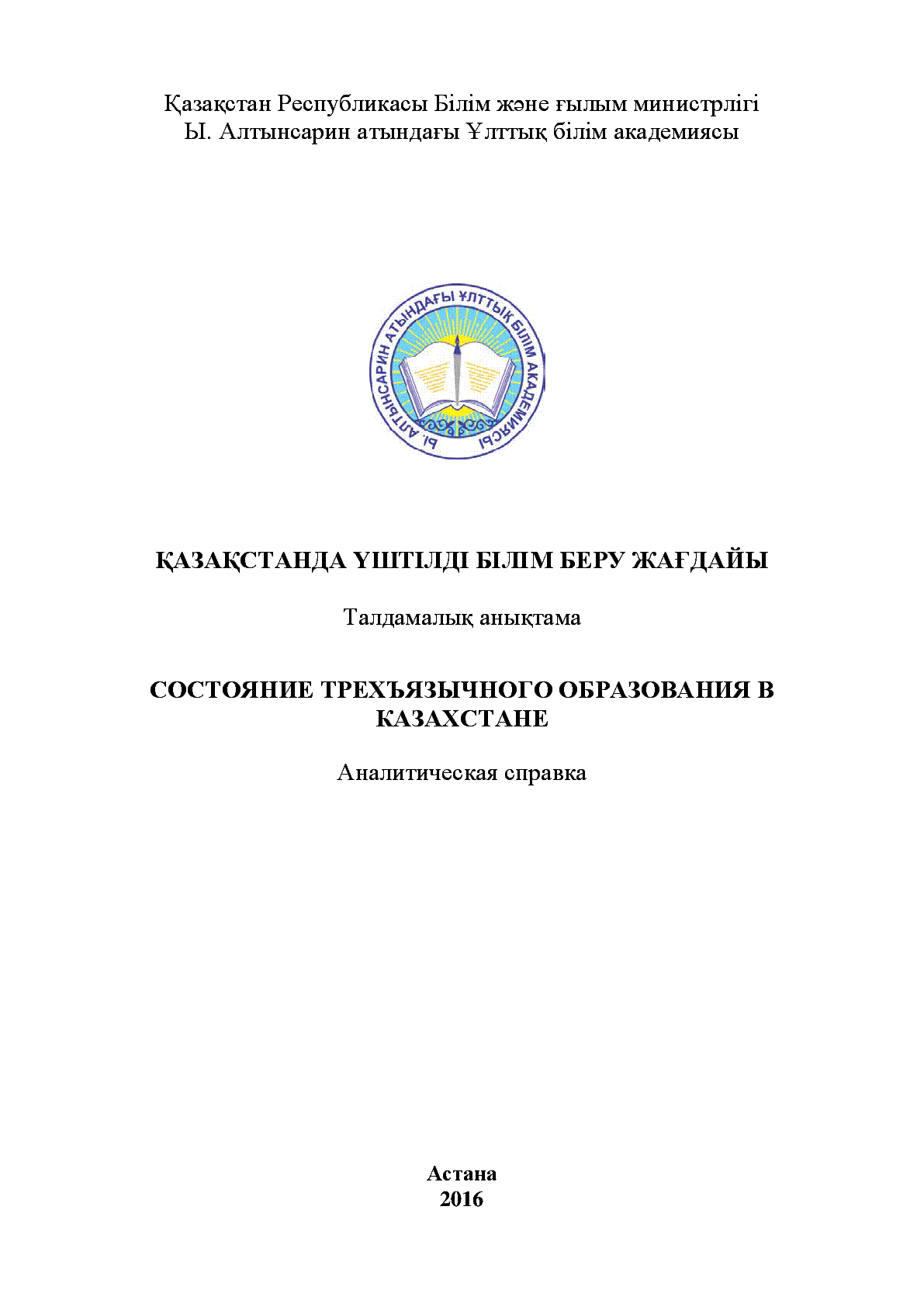 Қазақстанда үштілді білім беру жағдайы = Состояние трехъязычного образования в Казахстане [Text] : талдамалық анықтама / ; Қазақстан Республикасы Білім және ғылым министрлігі ; Ы. Алтынсарин атын. Ұлттық білім акад.... – Астана : [б. ж.], 2016. - 68 б. - Мәтіні қазақ және орыс тілд. . . – [т. ж.]