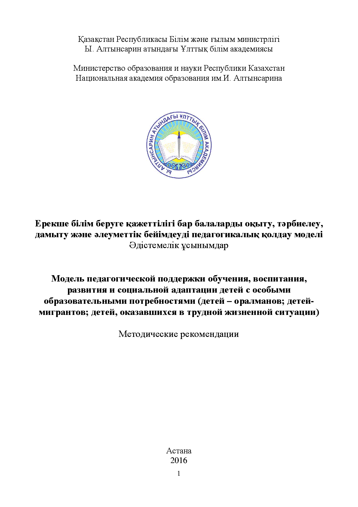 Ерекше білім беруге қажеттілігі бар балаларды оқыту, тәрбиелеу, дамыту және әлеуметтік бейімдеуді педагогикалық қолдау моделі = Модель педагогической поддержки обучения, воспитания, развития и социальной адаптации детей с особыми образовательными потребностями (детей-оралманов; детей-мигрантов; детей, оказавшихся в трудной жизненной ситуации) [Мәтін] : әдістемелік ұсынымдар / ; ҚР Білім және ғылым министрлігі ; Ы. Алтынсарин атын. Ұлттық білім акад.... – Астана : [б. ж.], 2016. - 76 б. - Мәтіні қазақ және орыс тілд. . – Библиогр.: 37-38 б., 74-75 б. . – [т. ж.]