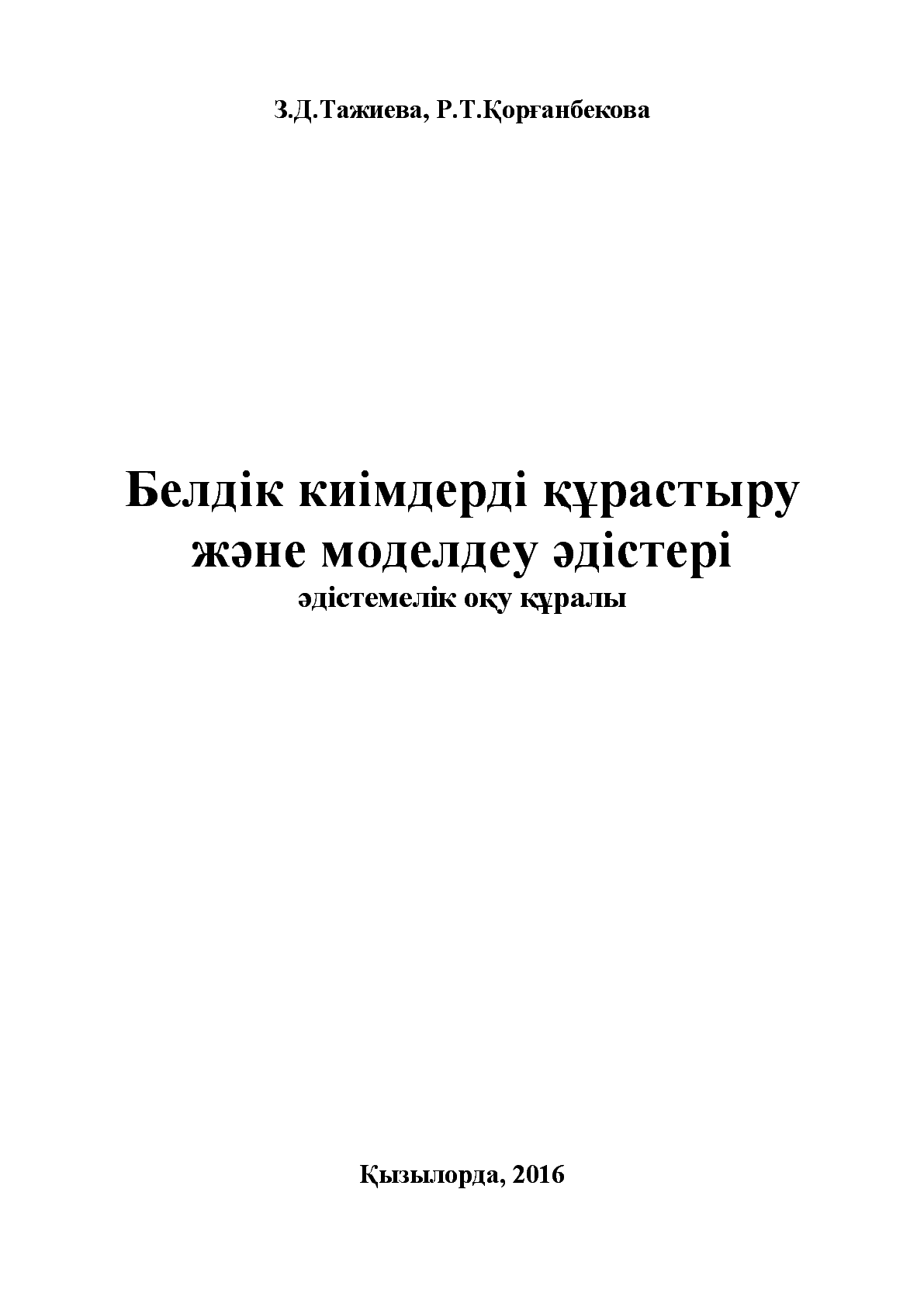 Белдік киімдерді құрастыру және моделдеу әдістері [Мәтін] : әдістемелік оқу құралы / З. Д. Тажиева Р. Т. Қорғанбекова ... – Қызылорда : [б. ж.], 2016. - 107 б., сур.; . – Библиогр.: 106-107 б. . – [т. ж.] – 978-601-278-842-6
